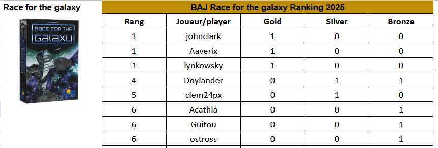 Classement BAJique Race for the Galaxy après 3 tournois: