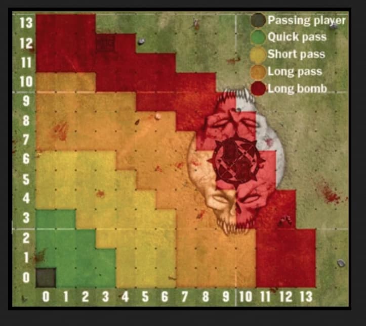 Il existe des modificateurs en fonction de la distance (déterminé par une réglette) Passe Rapide: pas de malus Passe Courte: -1 au résultat du dé Passe Longue: -2 Longue Bombe: -3