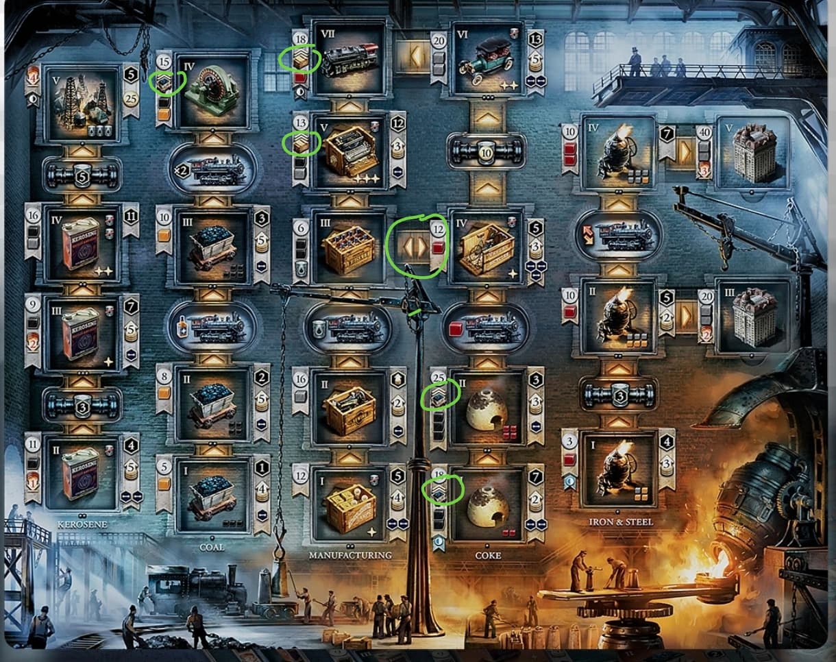 Coke is one the most fascinating elements in the new game. It’s a construction resource that sells to the markets, but when it does, it generates points as well as money. I only get the big points if there’s open coke demand, I have a flipped coal mine connected up ready, and enough cash in hand to construct the plant. Coke plants are great for points, but only when properly prepared and timed just right.