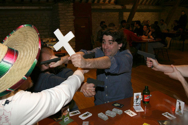 Dans le compte rendu des rencontres ludopathiques de Bruno Faidutti est évoqué une variante pour Ca$h & Gun$e, avec comme accessoire une grosse croix blanche (et aussi une carte noire avec une croix blanche) :
