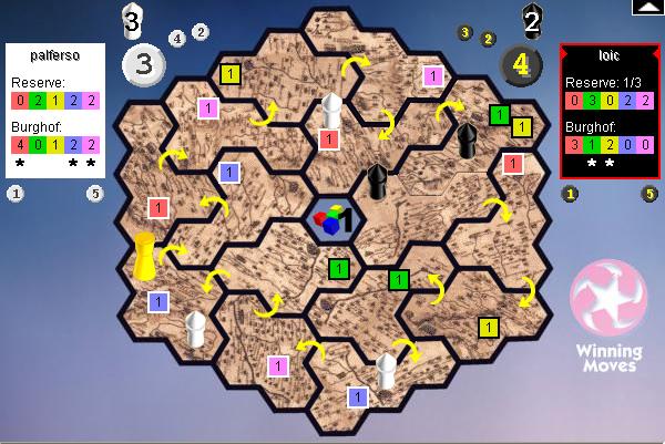 N'ayant qu'un choix avec un pion à 4 de déplacement c'est très embêtant pour établir une stratégie. C'est le principe de beaucoup de jeu : faire en sorte que l'adversaire fasse exactement ce que tu veux. Tu remarqueras que c'est à son tour de jouer et qu'il me contrôle également sur les jetons 1 et 5. Il peut ainsi choisir ce que je vais prendre. Cela lui permet de choisir en fonction du jeu. Il m'a ainsi pris le 1 m'empêchant de jouer deux fois de suite et construire une zone à 3 châteaux.