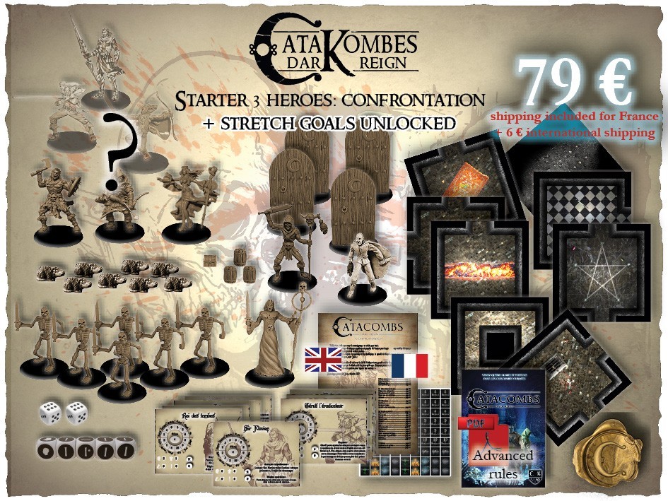 Avoue que c’est light… et après direct le “envoyez vos bourzoufs” avec la liste des pledges…« Catakombes dark reign » est un jeu de plateau avec figurines à l’échelle 32 mm. L’action se déroule dans des souterrains à une époque médiévale alternative. Les règles de jeux se veulent simples mais évolutives.