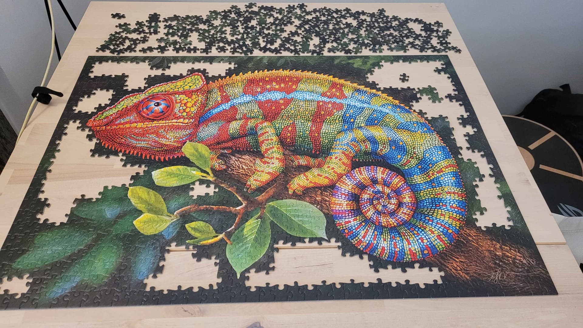 Un 1000 pièces d’un caméléon bigarré sur une branche. On était 4-5 dessus en permanence. Eh ben il fallait au moins ça, pq je suis resté 3h environ – un tri était déjà fait à mon arrivée – et à peine 50% était fait à mon départ et il restait le plus dur (les fucking monochromes).