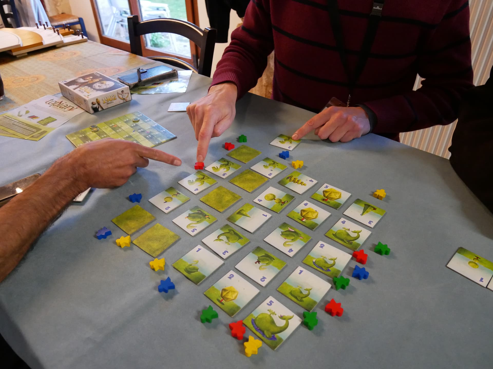 Topiary. Petit jeu de tuile et de pose de Meeple proposĂ© par Imprononçable @HumpfHumpf. Câest donc un jeu en 2D oĂč il faut imaginer une 3D. Les tuiles sont juste retournĂ©es, on ne peux pas les piquer, suivez mon regardâŠ