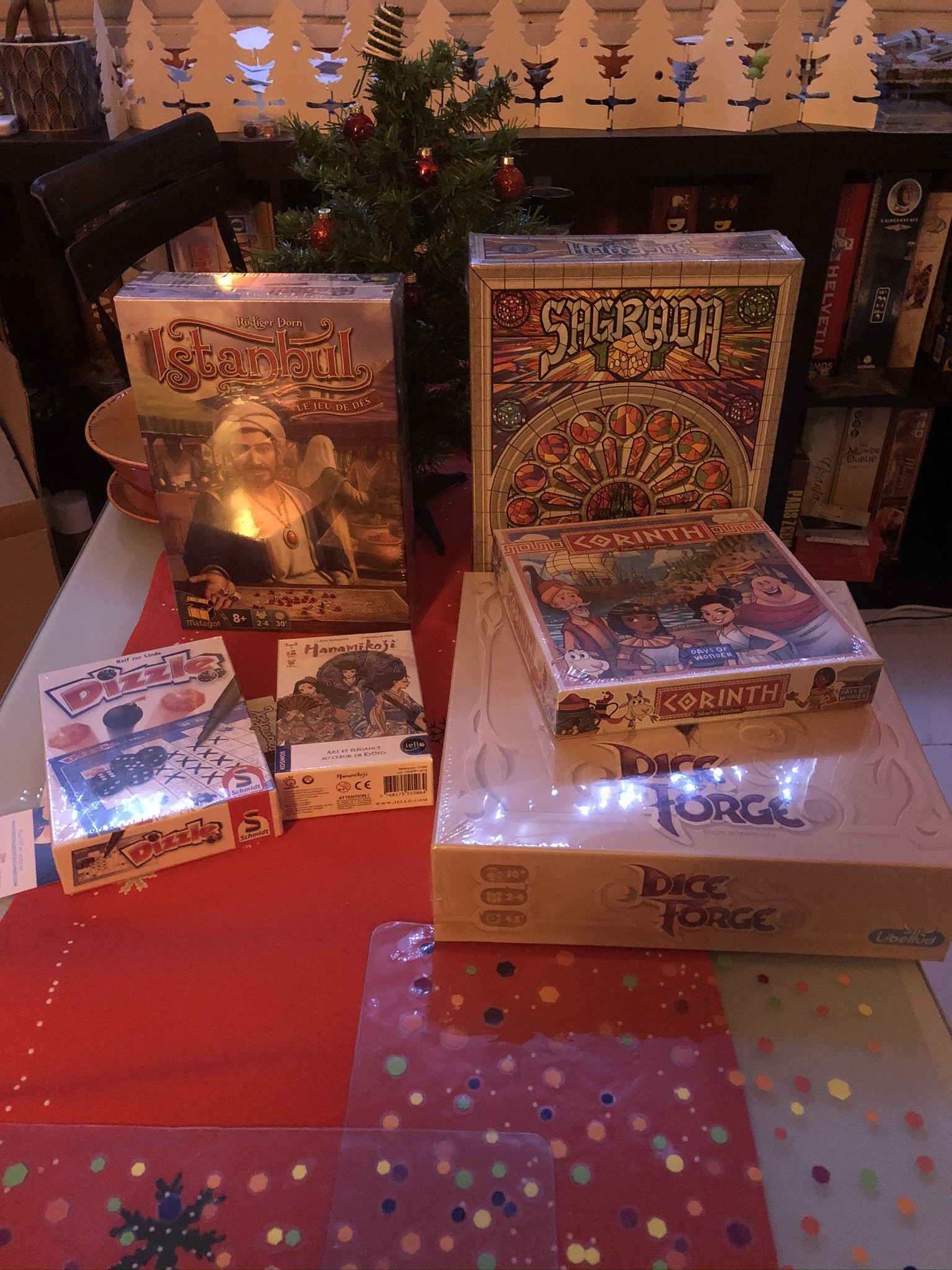 Et enfin le dernier - Dice Forge : Bon bah j'ai plusieurs fois hésité à l'acheter. Maintenant va falloir que j'achète l'extension ;). Ce jeu je l'aime depuis que je l'ai essayé la première fois en 2016 (pas mal pour un jeu sorti en 2017). Je dirais que c'est un gros risque de la part de mon père noël parce qu'acheter un jeu auquel je joue de temps en temps mais qui n'est pas dans ma ludothèque, il y en a certains c'est parce que je ne les aime pas. Pas le cas de ce jeu, du coup bien joué ;)