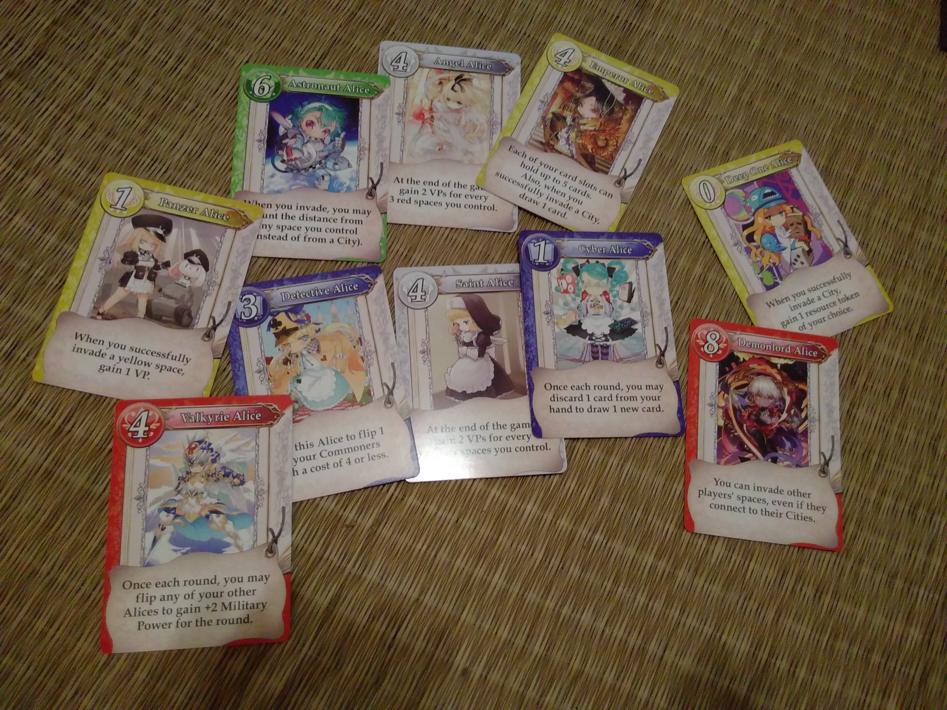 - Alicematic Heroes : un jeu improbable où faut invoquer des Alice pour conquérir Wonderland. Plein d’Alice : Alice détective, Alice Valkyrie, Ponzer Alice, Deep One Alice, Cyber Alice… Je vous mets un petit aperçu des cartes parce que c’est vraiment trop drôle. Çuilà, il sort au nouvel an avec les potes, j’ai hâte de le tester X)