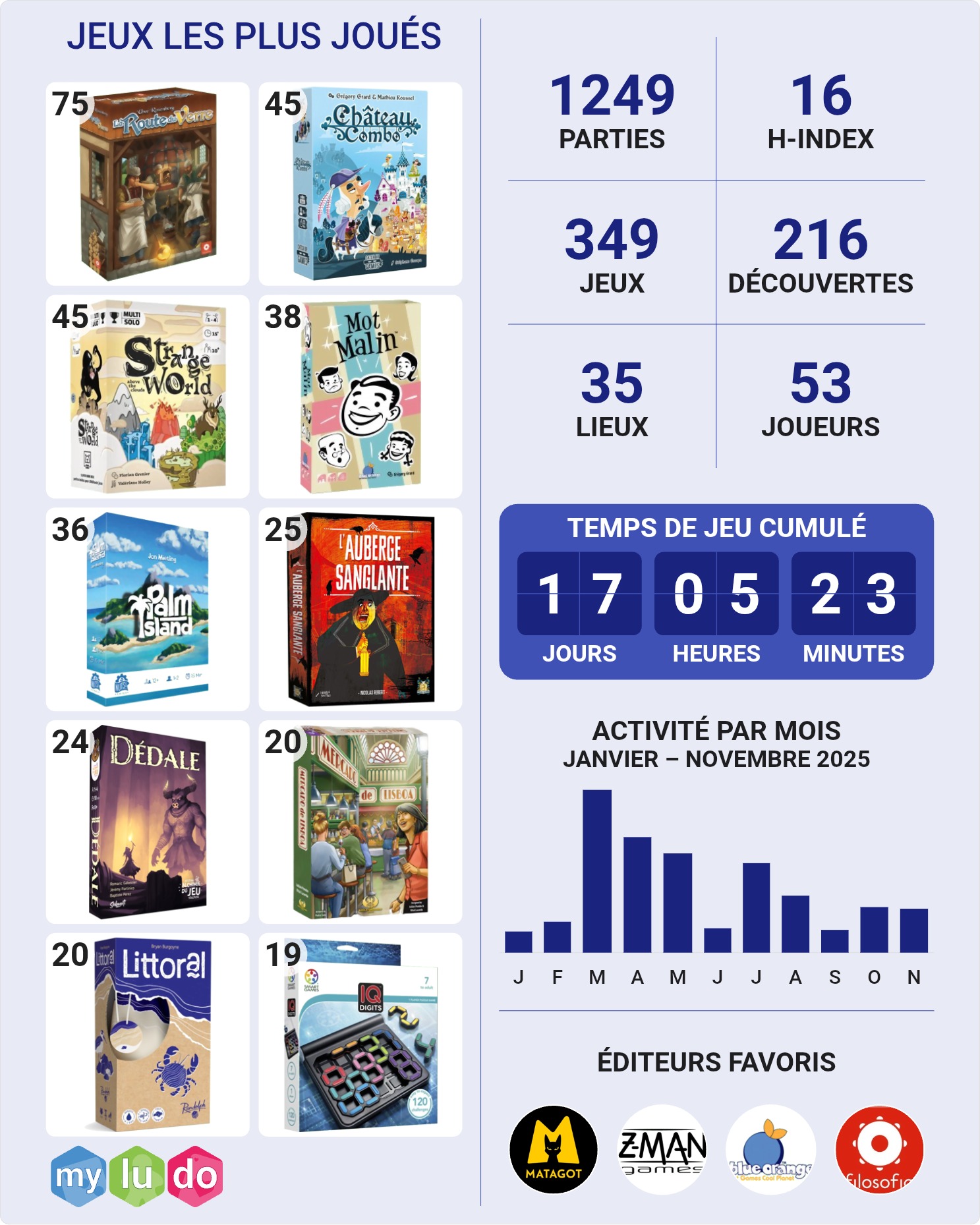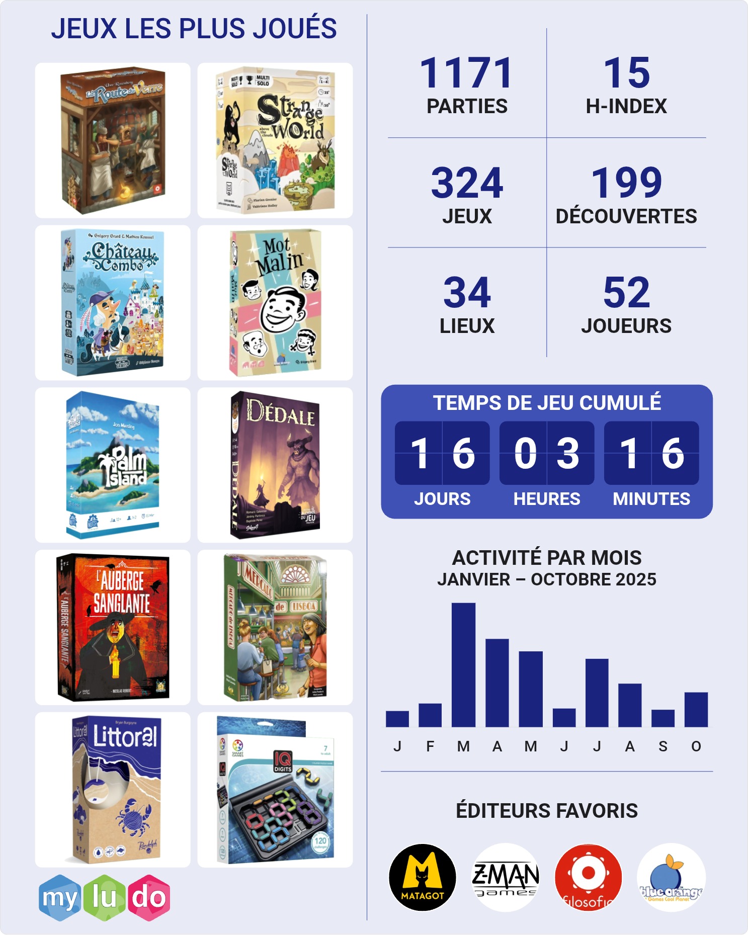 Par contre que 79 jeux différents depuis le début de l’année. Les 100 deviennent difficiles à atteindre sauf si j’arrive à gérer mon défi de rejouer à ce qui est dans la ludothèque : que 45% des jeux de la ludo joués cette année. On peu aller chercher les 21 manquants par là.