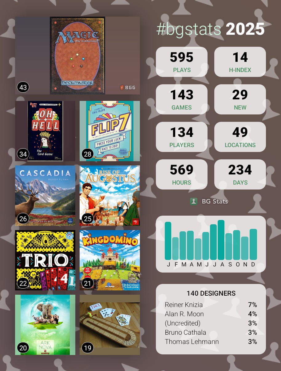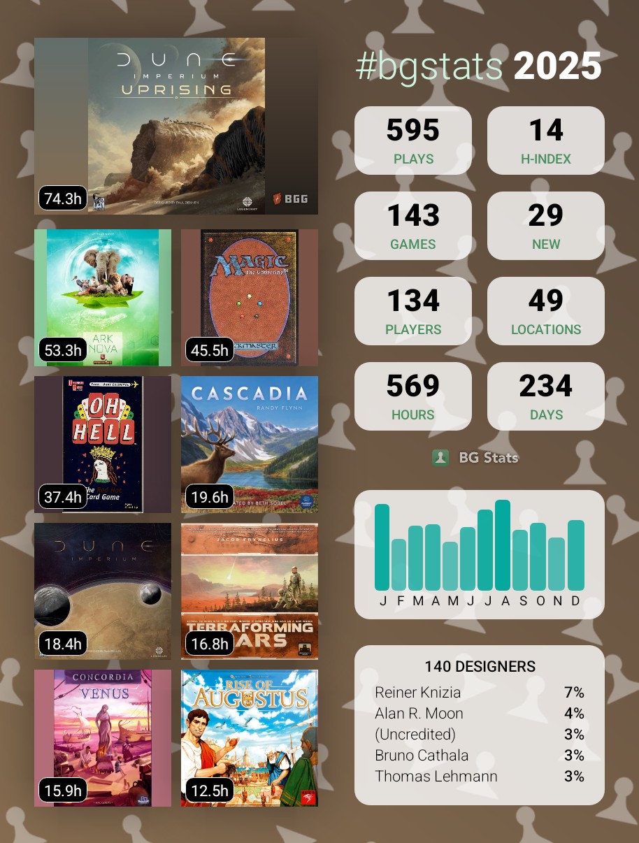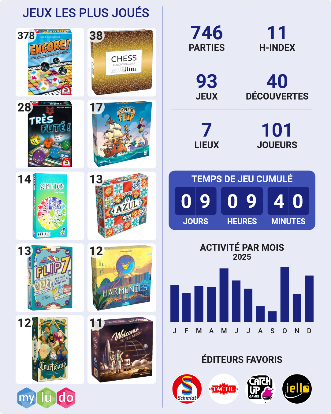 On le voit même si j’essaye de diversifier, je ne fais pas parti des jouentbeaucoup comme dirait @ThierryLefranc. Et 94 parties donc pas non plus beaucoup de jeux très approfondis (Maximum: Château Combo à 12 parties). H-Index 4 qui confirme cela.