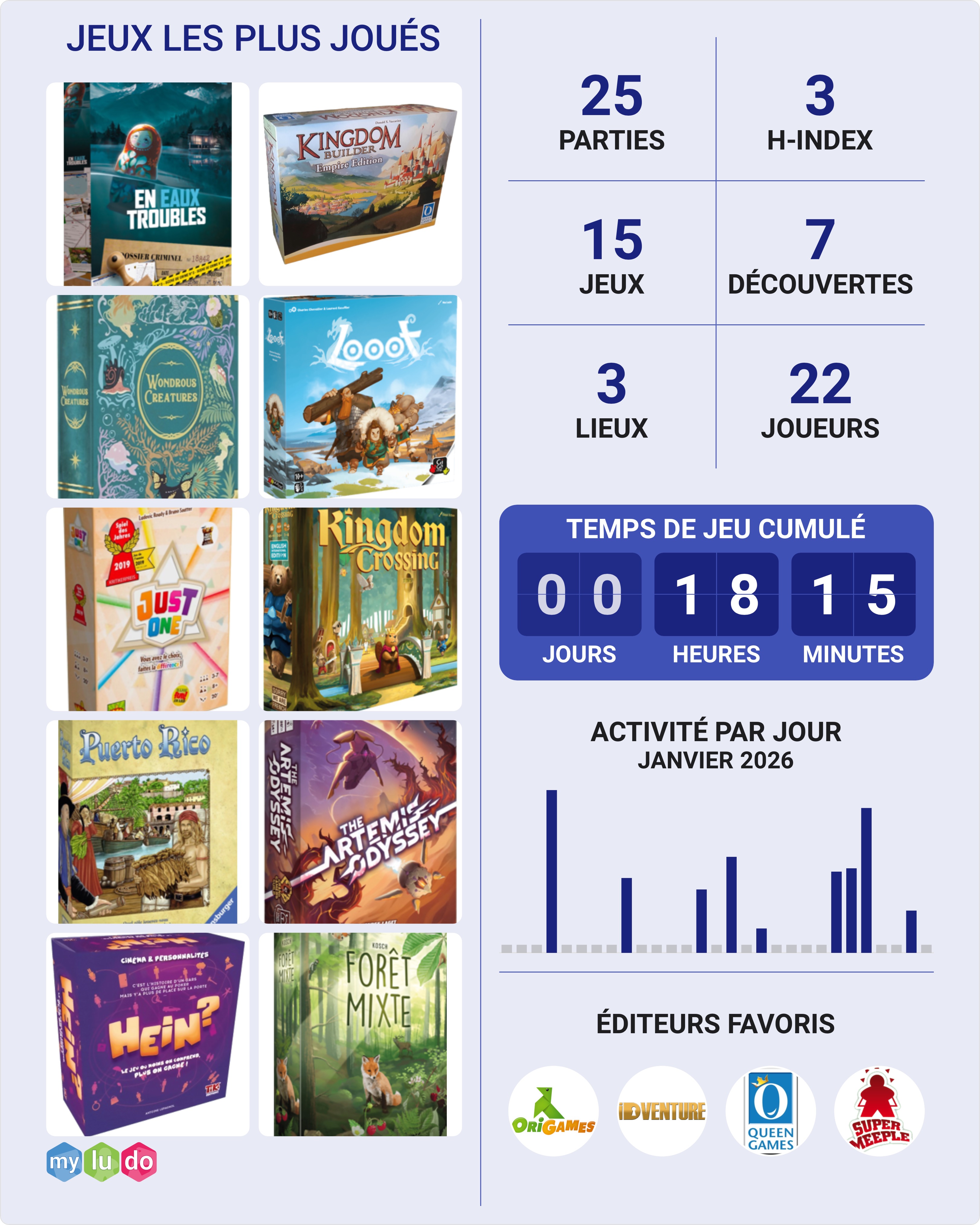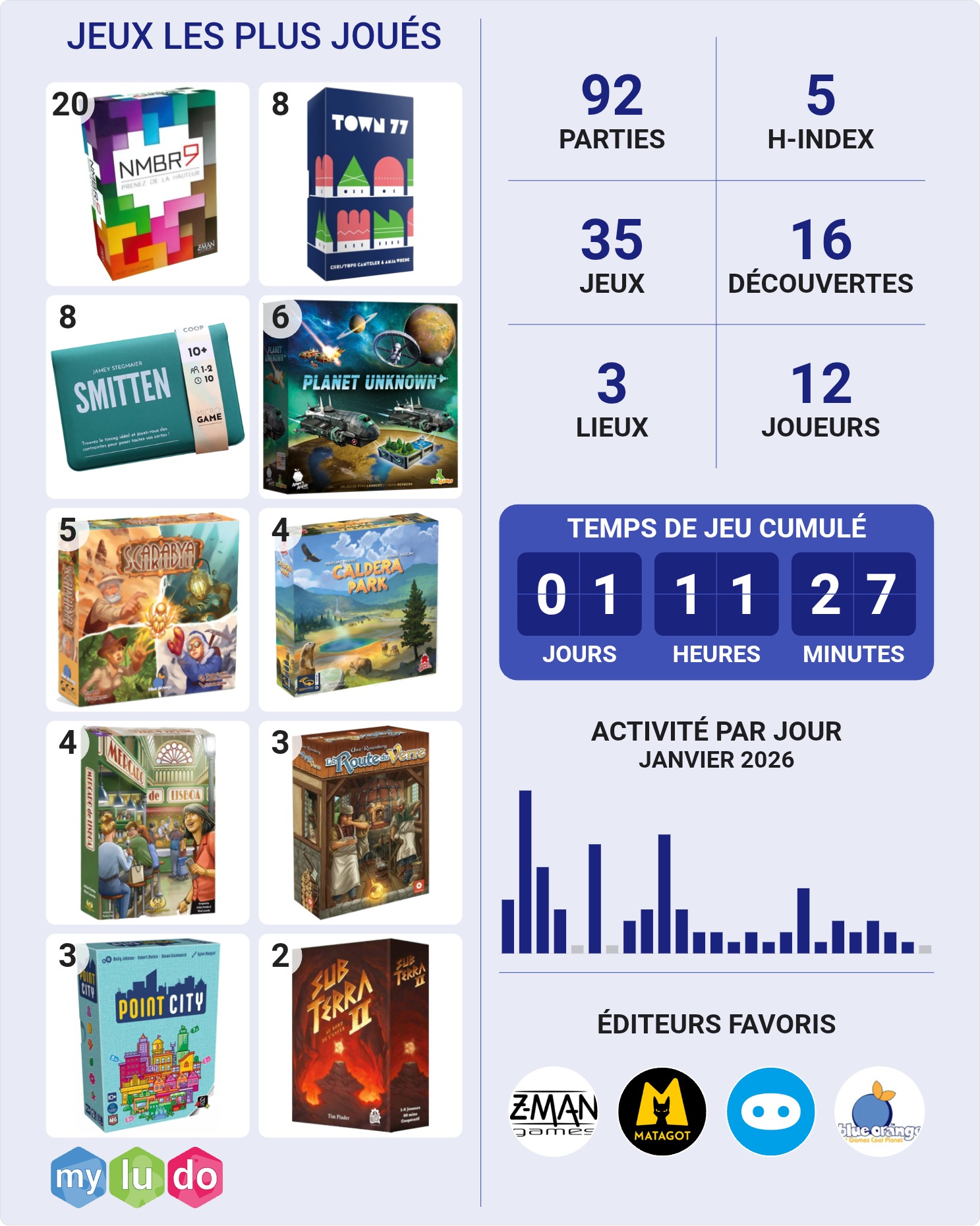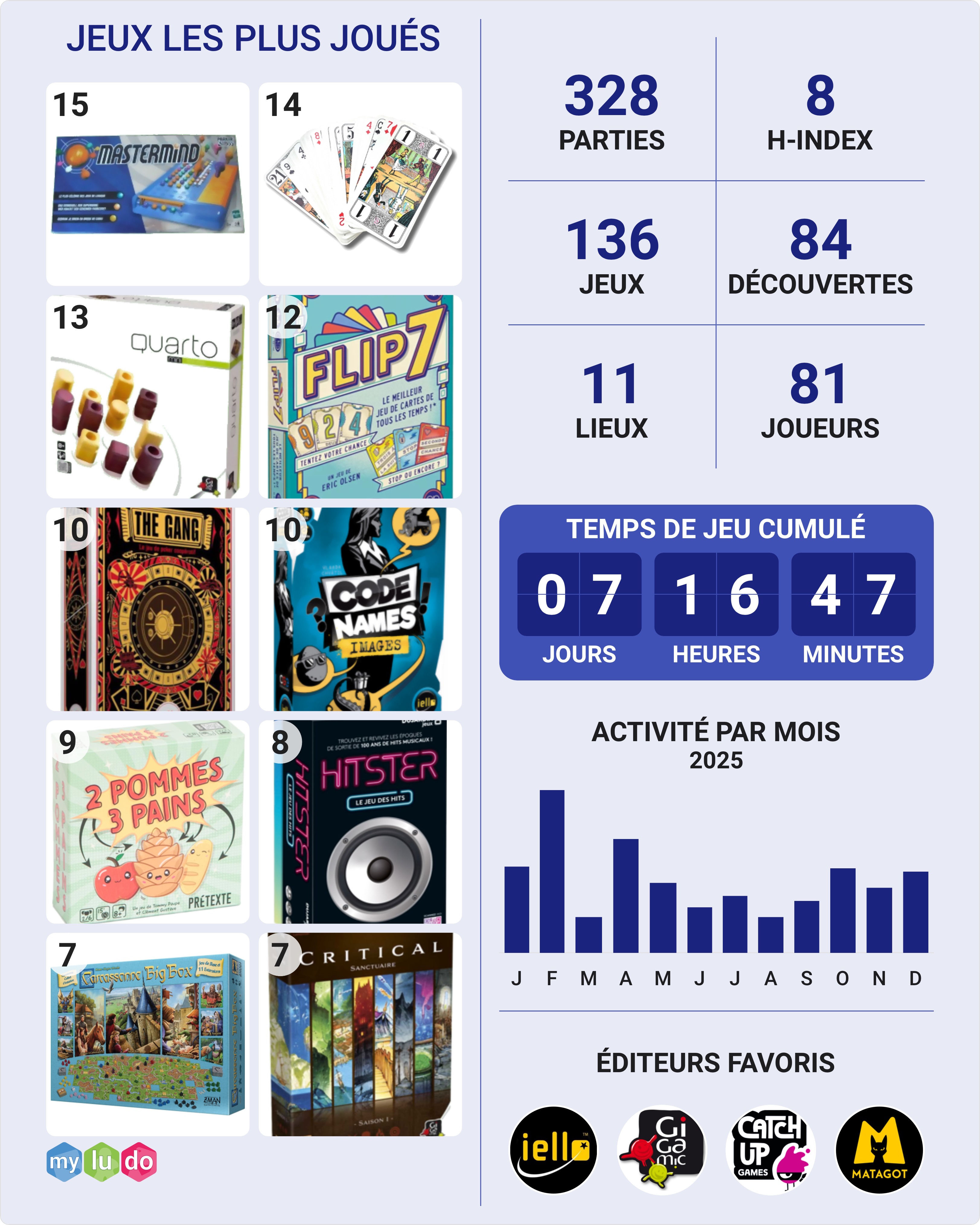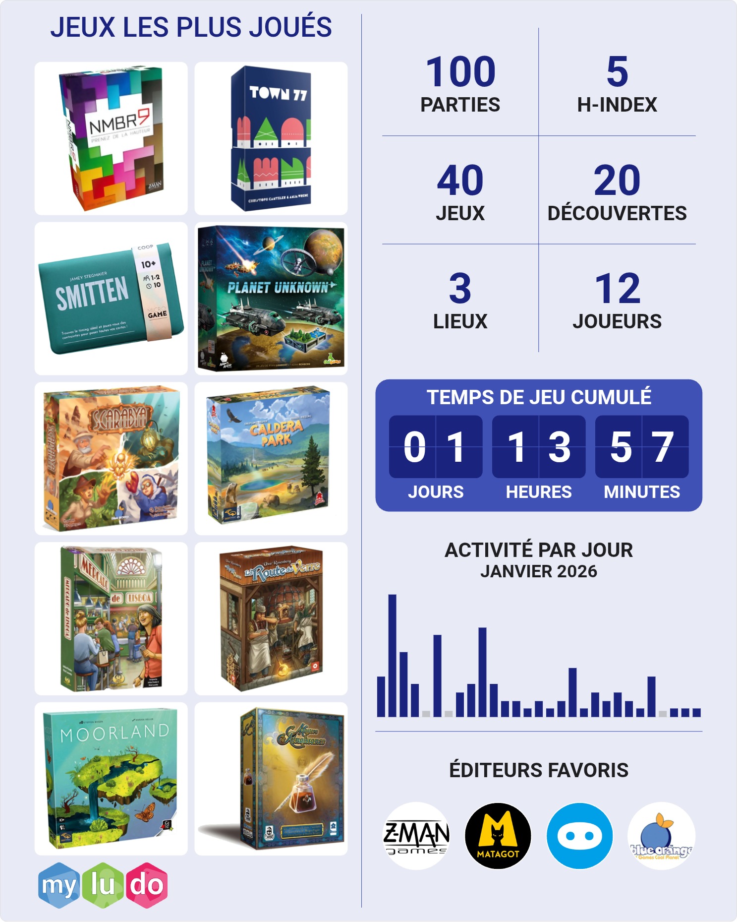 Pour la 12eme année (!!) consécutive, à la demande de personne, je propose ce challenge de 50/100/150/200/250/300 (!) jeux différents joués dans l’année, sur table ou ailleurs si vous préférez mais avec des joueurs à qui parler. Enfin si vous vous parlez tout seul comme moi en solo ça peut compter aussi!