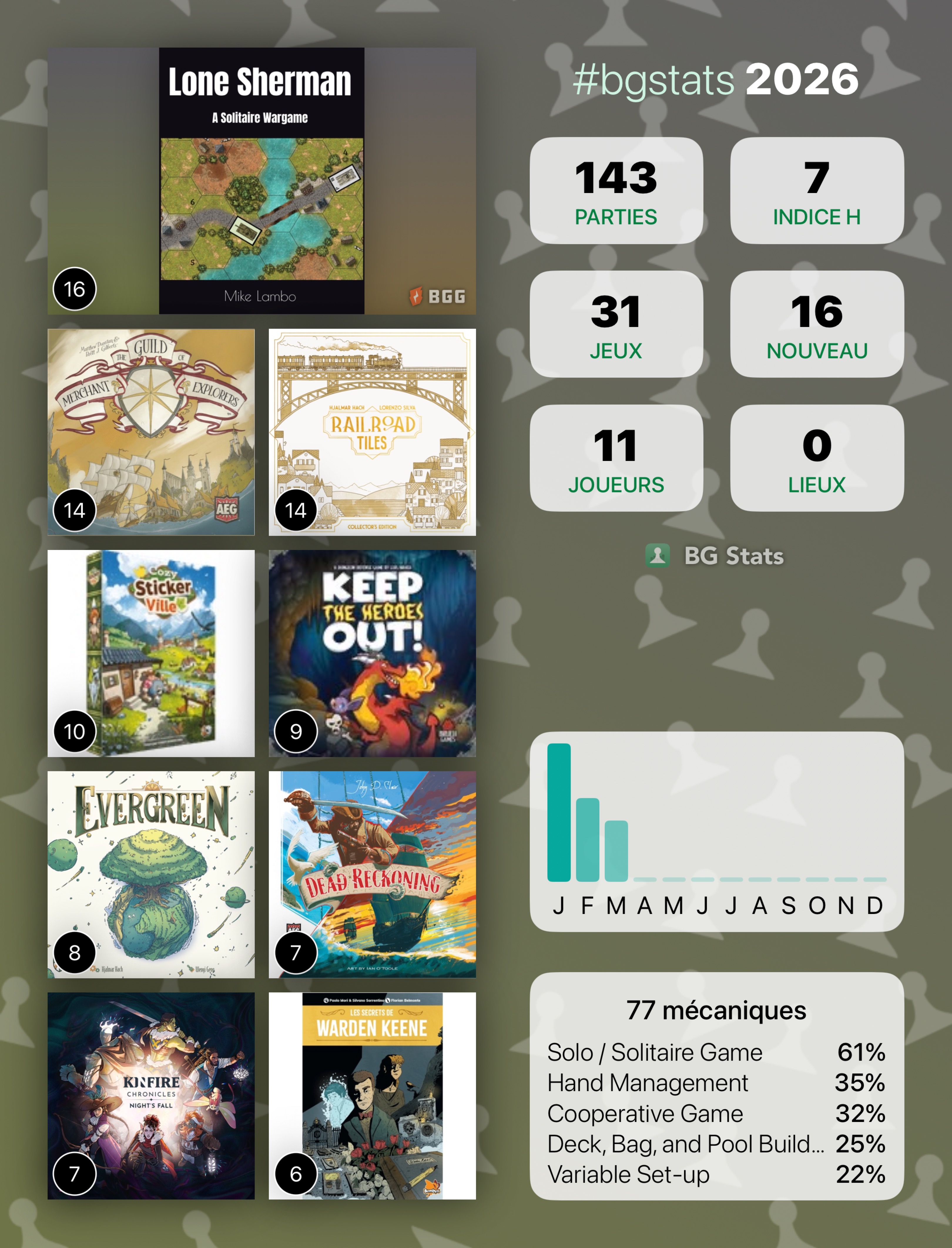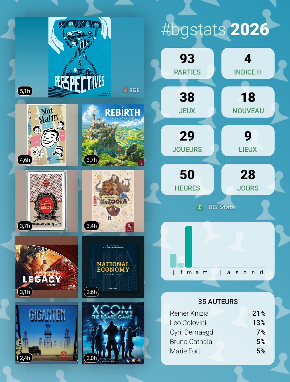 100 parties tout rond de 77 jeux différents, dont 26 petits nouveaux. Début d’année en douceur, va falloir accélérer le rythme. ![]()