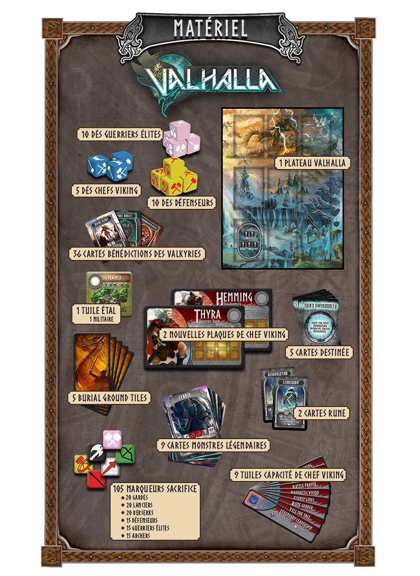 Dans cette deuxième extension, vous pourrez vous rendre au Valhalla grâce à son plateau. Là-haut, vous dépensez des jetons Sacrifice obtenus lorsque vos guerriers périssent au combat. D’autre part, vous ne serez plus seulement spectateur puisque vous prendrez personnellement part au combat grâce à votre dé Chef viking qui vous permettra d’activer votre capacité de combat.