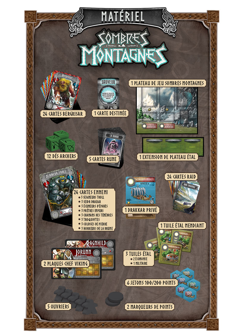Grâce à cette première extension, un 5ème guerrier viking pourra entrer dans la compétition et défendre sa place en tant que nouveau Jarl ! Plus de Vikings, donc plus de place : le plateau s’agrandit au moyen d’une extension du Marché, ainsi qu’un plateau supplémentaire représentant les Sombres Montagnes.