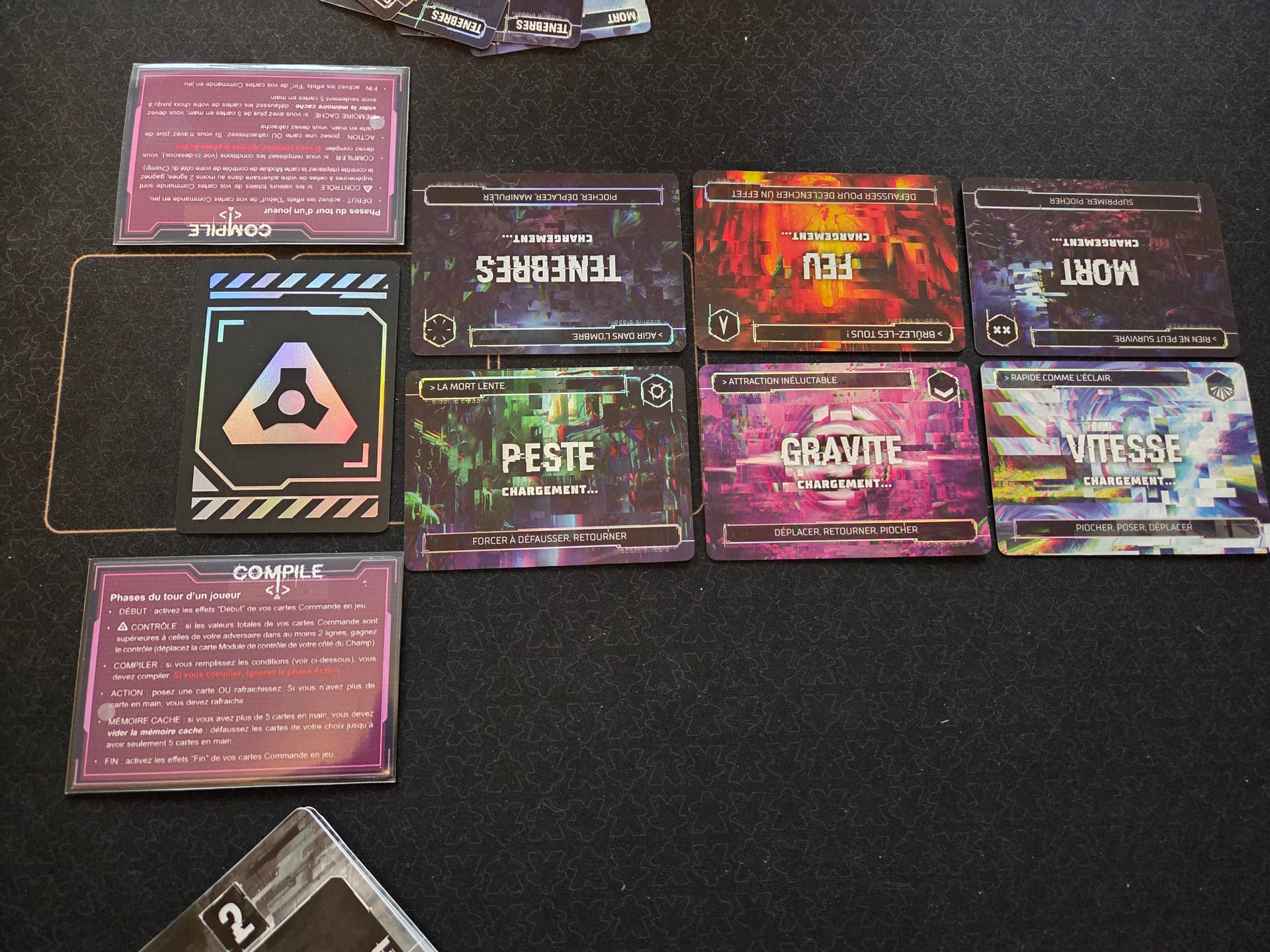 Compile est un jeu de cartes en duel, où on s’affronte à coup de Commandes pour être la première IA à compiler ses trois protocoles. Il est édite en français par Geek Attitude Games.