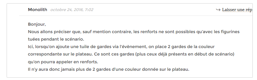 Monolith voulait peut-être dire : “Les renforts sont limités aux nombre de sous-socle indiqués dans le setup” Parce que je l’ai joué d’après les règles et voilà ce qui s’est passé : Conan a tué les deux unités rouges, j’ai dépolluer la rivière et je n’avais donc que deux tuiles. Au tour 3 j’avais une unité de 6 gardes bleus. autant dire que c’était mort pour Conan (avec renfort + activation un tour sur deux puis activation + activation un tour sur deux ! Les trois gemmes de récupération sont largement suffisantes. Le phénomène de gène fini par bloquer Conan et la partie est terminée) Donc, non, ce serait une énorme erreur d’ajouter des figurines supplémentaires. D’autant que cela rend caduque la deuxième option de renforts (ajouter une tuile) car cela augmenterait le coût d’activation des tuiles par rapport à une rivière avec juste la tuile événement et la tuile d’unité bleue (ou rouge).