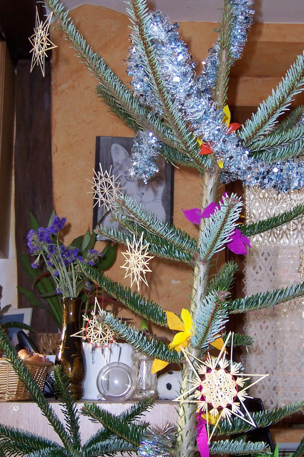Le plus beau, c'est le nôtre ! Enfin, celui de l'an dernier. Un sapin destroy tout dégarni, récupéré dans une poubelle. Il allait mourir, on l'a sauvé, on l'a décoré, il nous a fait suer en nous bloquant un peu le passage, il penchait à fond, mais on l'a gardé jusqu'en avril, toujours aussi vert, aussi beau ! Au sol, pour faire la neige, on a mis des combinaisons de peinture en intissé. À la fin, on y croyait à la neige. Il était tout déplumé, le sapin, pas facile à garnir, surtout qu'on a été pris de court : des vieilles guirlandes tati, et j'avais fait des étoiles en paille et des fleurs en papier crépon. Les couleurs ne vont pas, mais j'avais que ça. On lui a aussi ajouté un super daim fabriqué avec de la corde et un bout de thuya du jardin. On a adoré ce sapin. Je crois qu'il choquait beaucoup de monde. On voyait bien que lui et nous, on avait essayé de faire de notre mieux, mais qu'on n'avait pas super bien réussi. Il faisait marrer pas mal de monde aussi. La grande attraction de l'an dernier, notre sapin ! (et du reste, on en a encore un morceau à la grange).