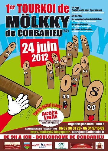 L’association Alors…JOUE! est heureuse de vous proposer le 1er tournoi de Mölkky du Tarn et Garonne qui aura lieu le 24 juin 2012 à Corbarieu (Entre Montauban et Fronton).