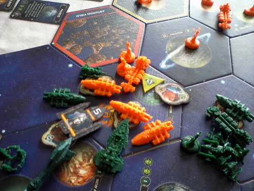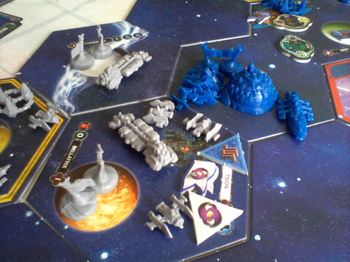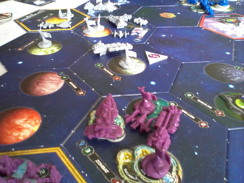 Une grosse flotte est affectée à cette mission et se débarrasse des forces en présence, mais un diplomate empèche l’invasion de la planète se trouvant dans le système. Notons au passage que le Xxcha a eu la brillante idée d’ammener un vaiseau de chaque type, ce qui ne fait pas vraiment gagner du temps sur les jet de dés… ![]()