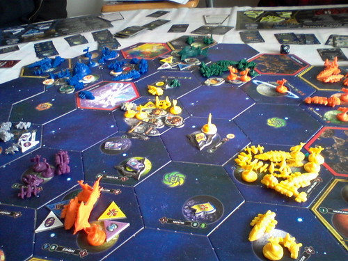 Juste un petit conseil: selon moi, mieux vaut éviter de refiler les xxcha à un débutant, je trouve que c’est l’une des races les plus faibles et ennuyeuses à jouer. Elle est résolument orientée défense, alors que les objectifs choisis, comme tu l’as dit toi-même, poussent au combat. Surtout que les autres plus expérimentés avaient des races plutôt balèses et faciles à jouer (Hacan, Jol-Nar, L1z1x principalement).