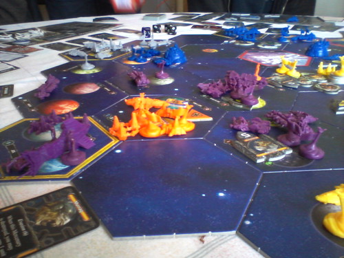 Chez nous, il est 11h. Mais dans la Galaxie qui s’éttend sous nos yeux, l’heure de la reconquête est venue ! Tout le monde commence par prendre le gros système qu’il a pu placer devant chez lui. Puis Mentak et L1z1x produisent directement dans leur HS. Le Jol-Nar utilse sa carte Diplomacy pour annexer tranquillement une planète contenant un véritable Artefact. Le Yin en profite lui aussi pour s’étendre un peu.