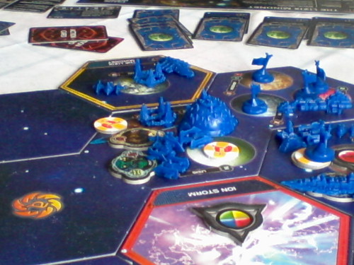 Le Jol-Nar lance tout de suite Assembly, devient speaker, et fait piocher une loi : on devrait à l’avenir payer des ressources pour envahir des planètes neutres… Tout le monde refuse. C’est ensuite au tour du Xxcha de trouver un artefact.