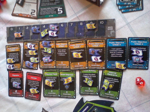 Légère variante au niveau de bureaucracy : le deck d’objectif fait 6 stage I + 5 stage II, pas d’Imperium Rex. Au début du jeu, on révèle 3 objectifs. En plus, j’ai forcé le deck à contenir au moins 3 objectifs de niveau I et 2 de niveau II “guerriers”, histoire d’éviter le scénario de notre partie précédente.