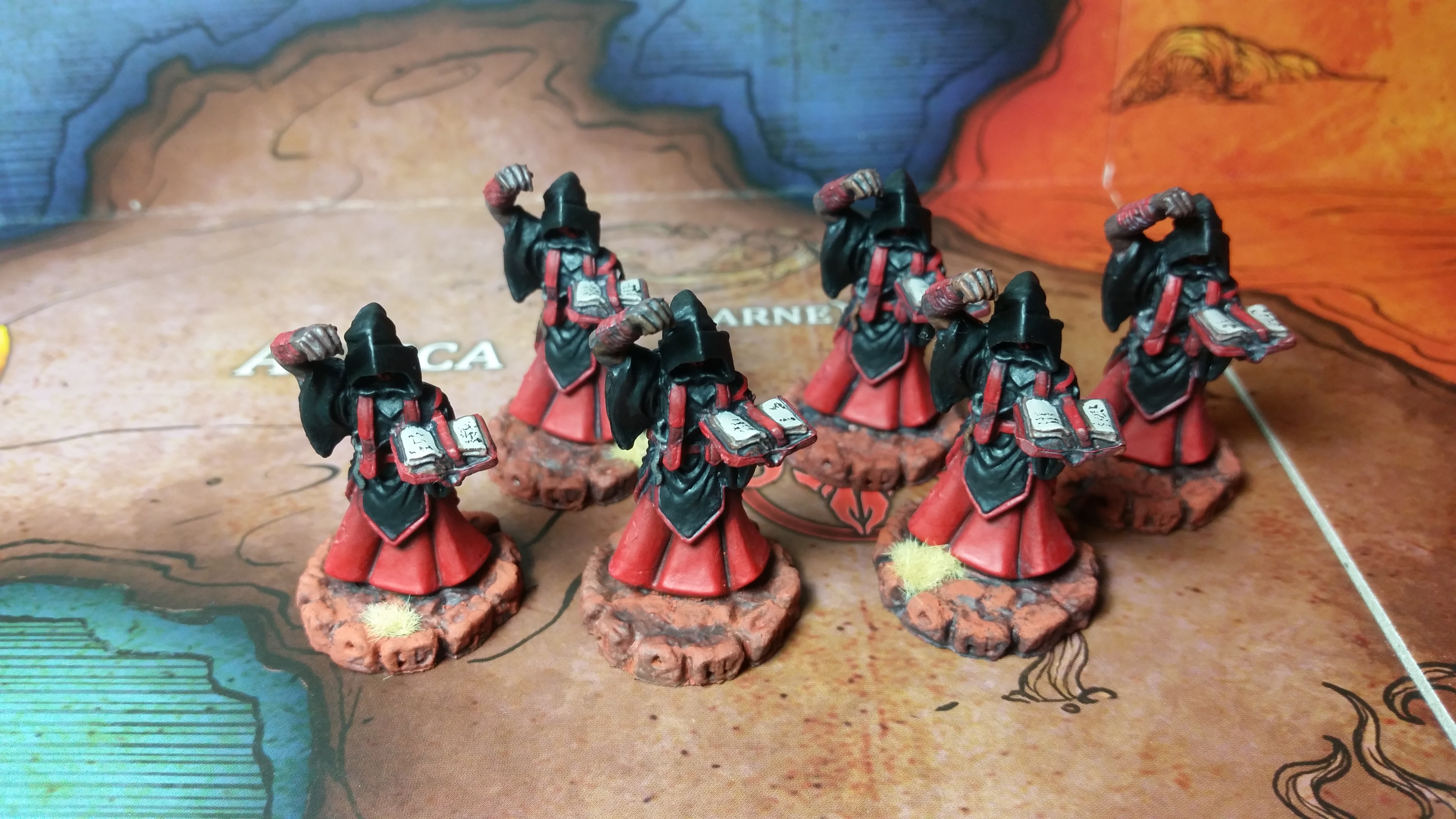 Le but était de typer la faction "culte Africain" notamment avec la peau noire et le socle ocre rouge. J'ai utilisé des pigments, mais la sculpture des socles étant ce qu'elle est (je suis pas fan), c'est pas ressorti comme je le voulais.