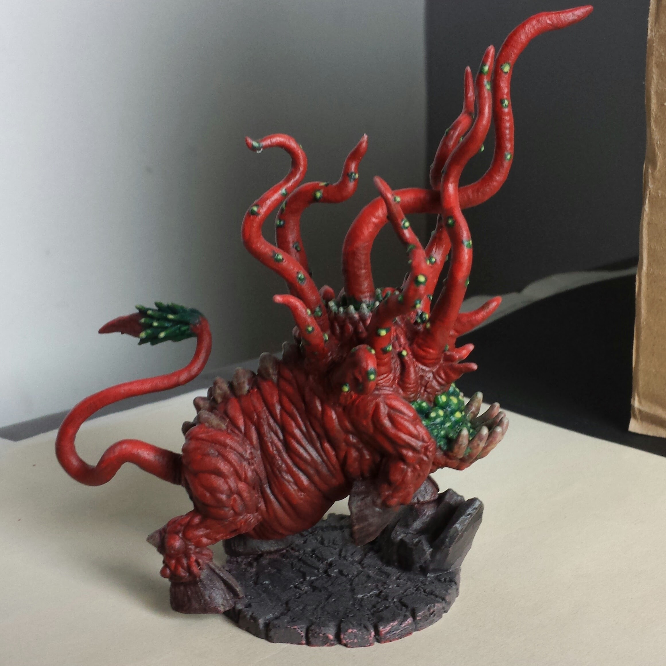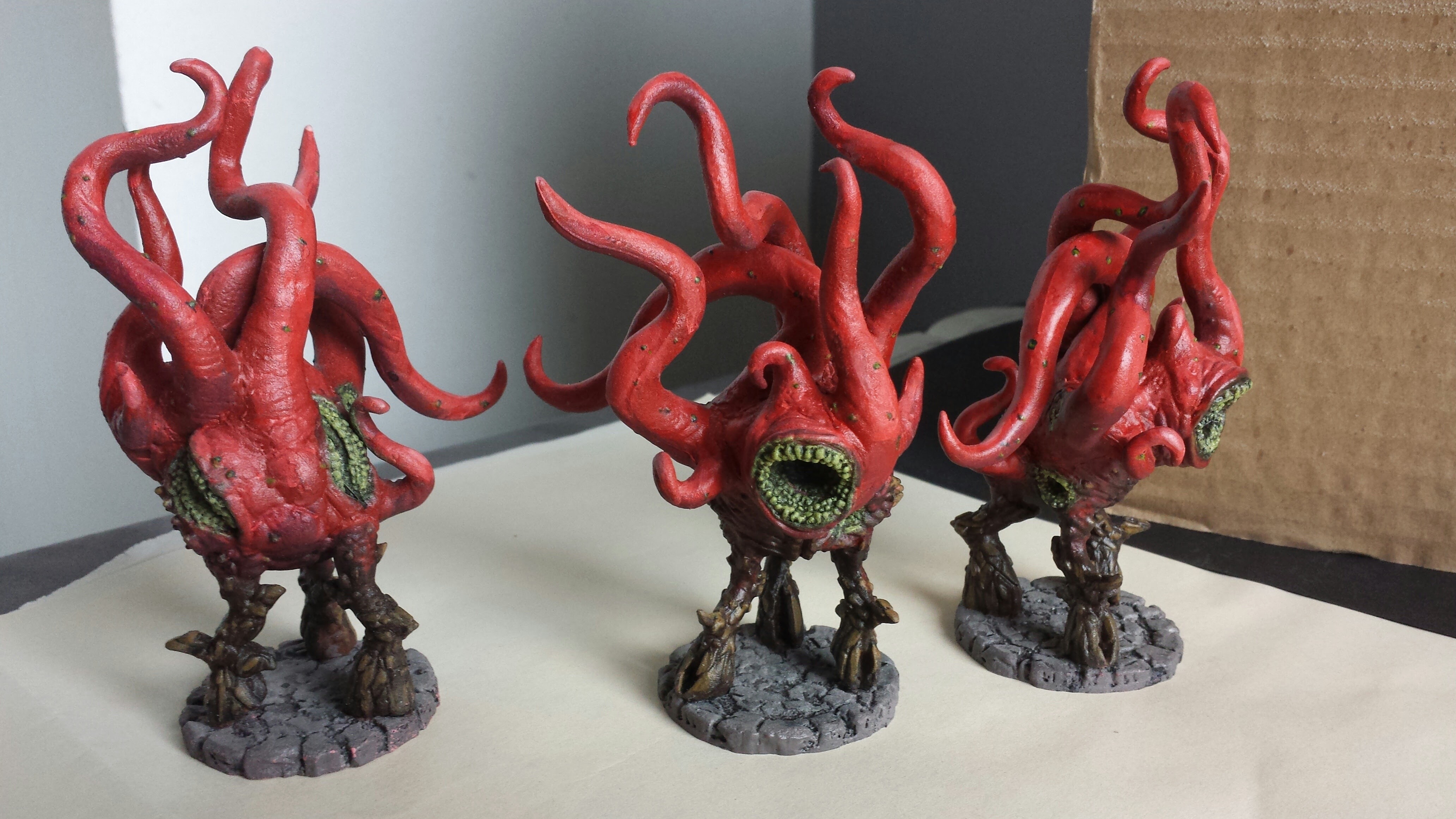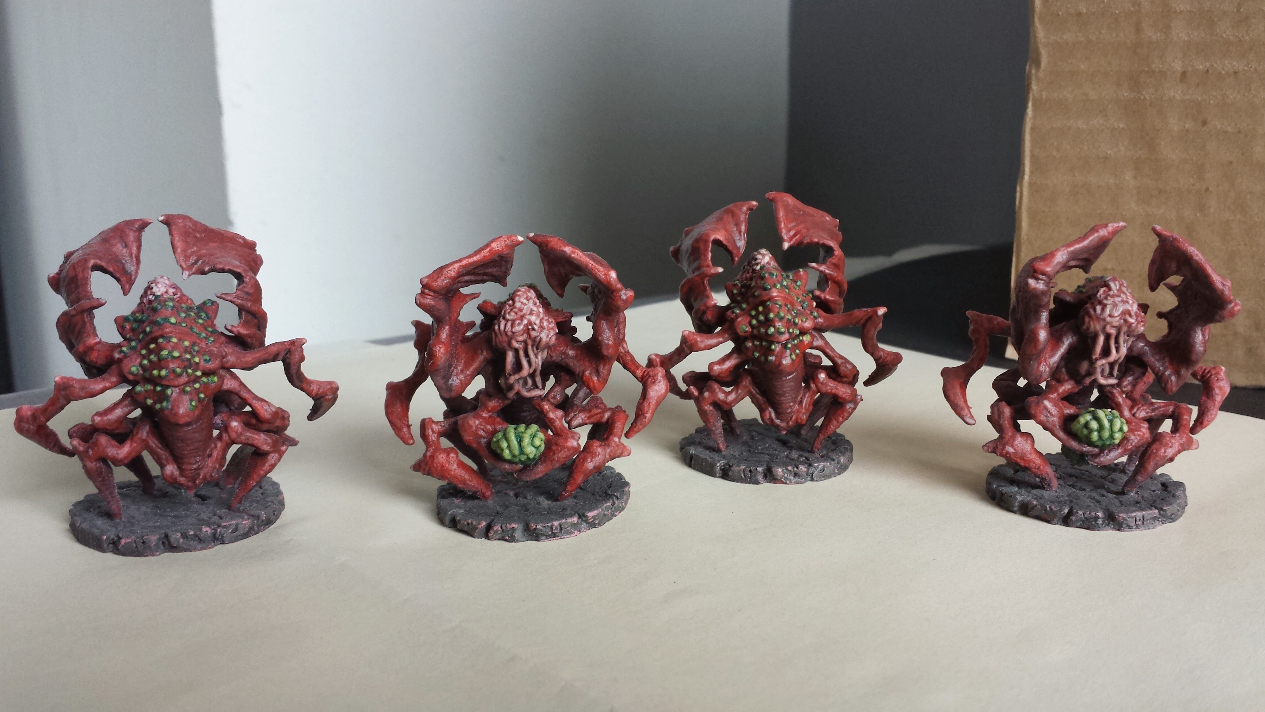 Après la famille verte au printemps dernier, j’avais enchainé avec la rouge, mais les sombres rejetons m’avaient donné du fil à retordre et j’avais laissé reposer après le trio. deux parties du jeu ces derniers temps m’ont regonflé la motiv’ et je m’y suis remis…Avec grand plaisir ! J’ai bien apprécié de peindre shubbi et tout autant les mi-go ( pas les figs préférées des peintres du fil semble-t’il, j’ai beaucoup aimé pour ma part).