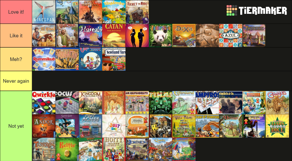 Comme je suis une grosse feignasse, j’ai réutilisé une tier-list déjà existante mais sans les 2 derniers vainqueurs: Pictures et MicroMacro. L’auteur de la liste, qui est un petit rigolo, avait planqué 5 Kennerspiel, mais bon on fera avec ! Classez-moi tout ça, commentez, critiquez !