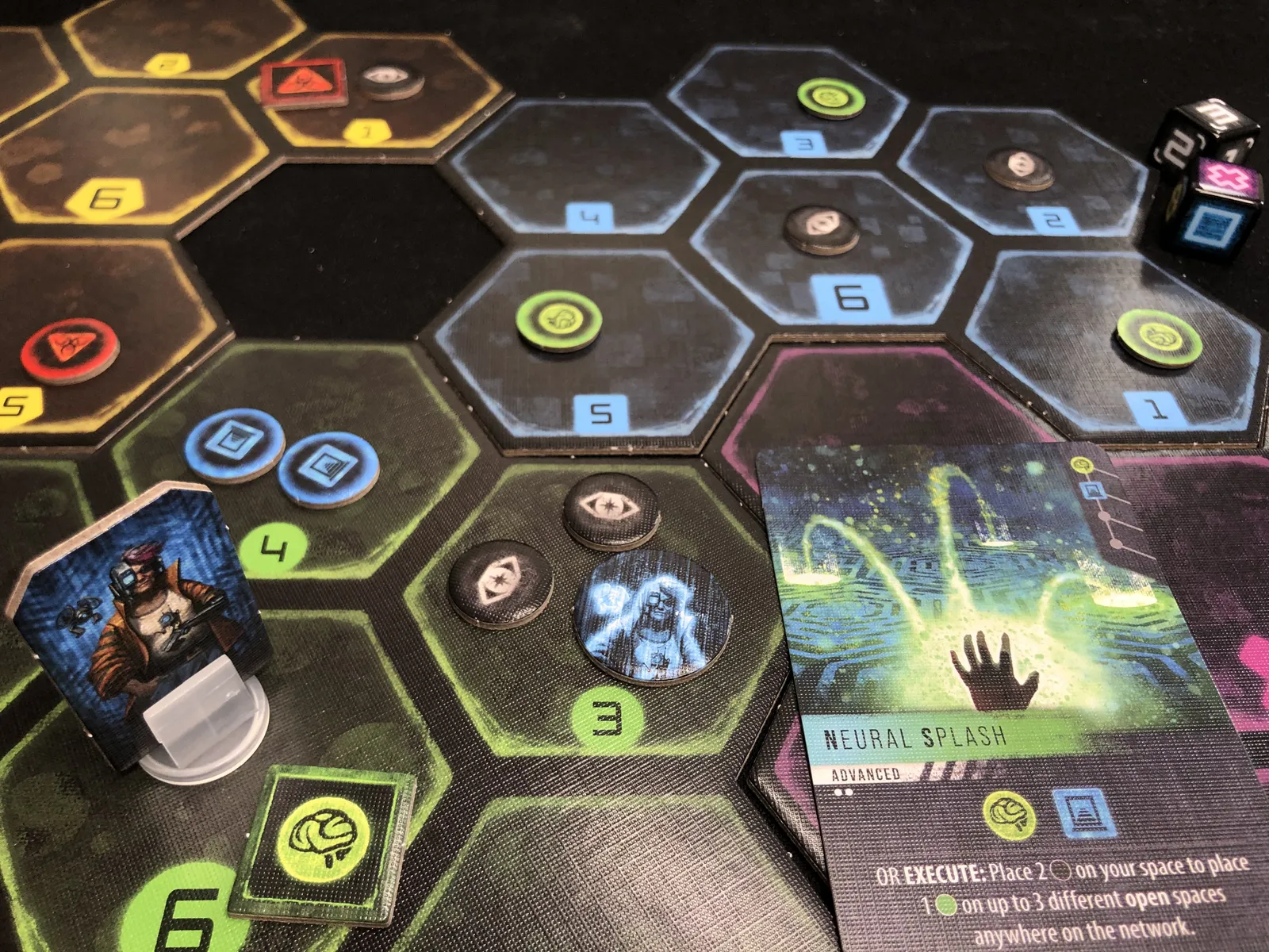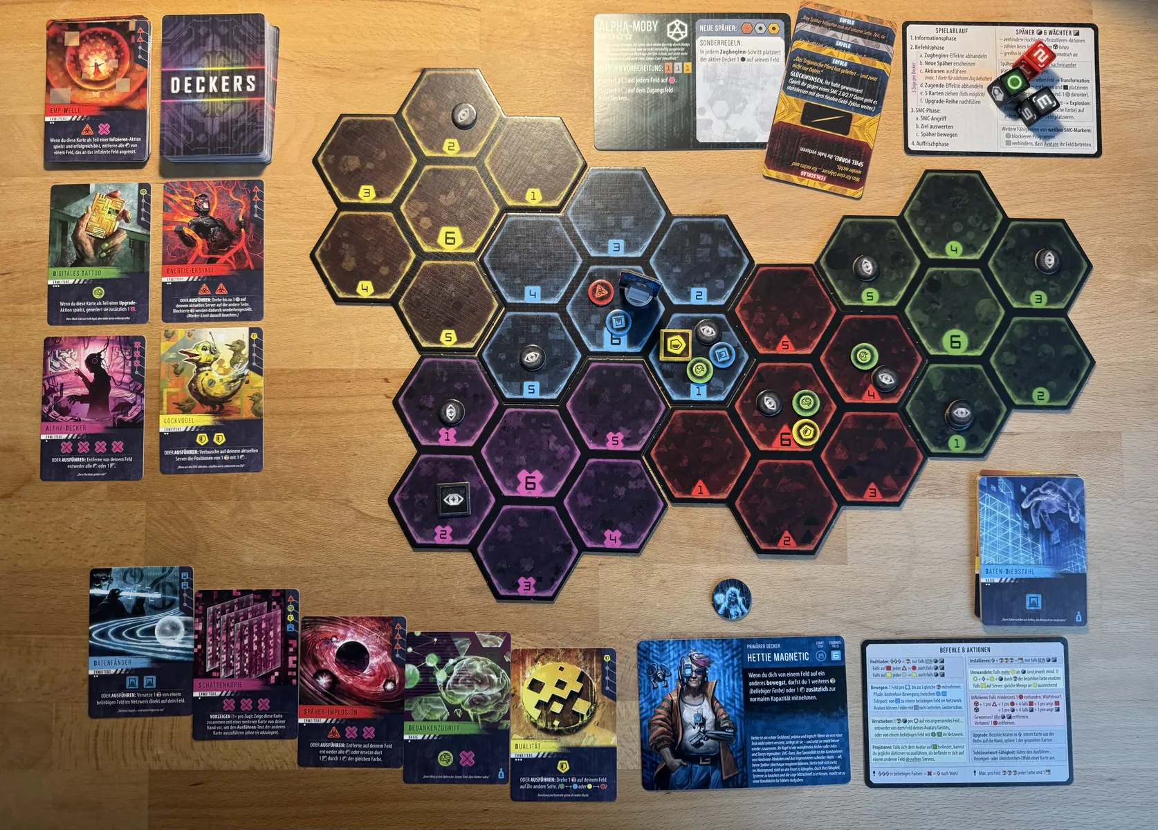 Ce que je note rapidement, c’est que les termes biscornus pour les différents pions ronds / carrés de toutes couleurs, ces termes dont personne ne pouvait se rappeler même si l’intention de soutenir le thème était louable, ces termes (disais-je donc) se font plus discrets dans les nouvelles règles : on y évoque plus facilement et simplement un programme (petit pion rond) rouge ou une installation (pion carré) verte…