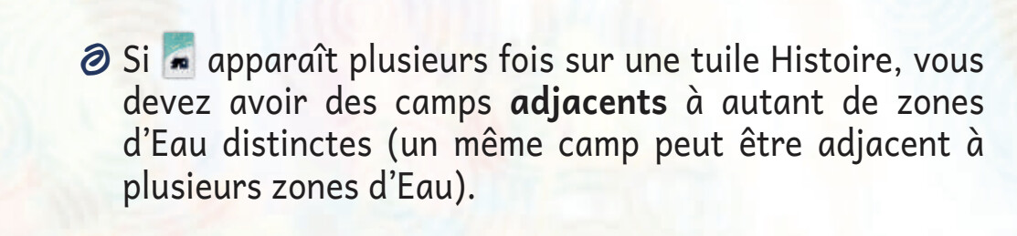 Mettre un camp (hutte) entre les deux zones d’Eau ( comme le joueur jaune l’a fait) te permet de valider 2 cartouches de zone d’Eau avec 1 seul camp (hutte).