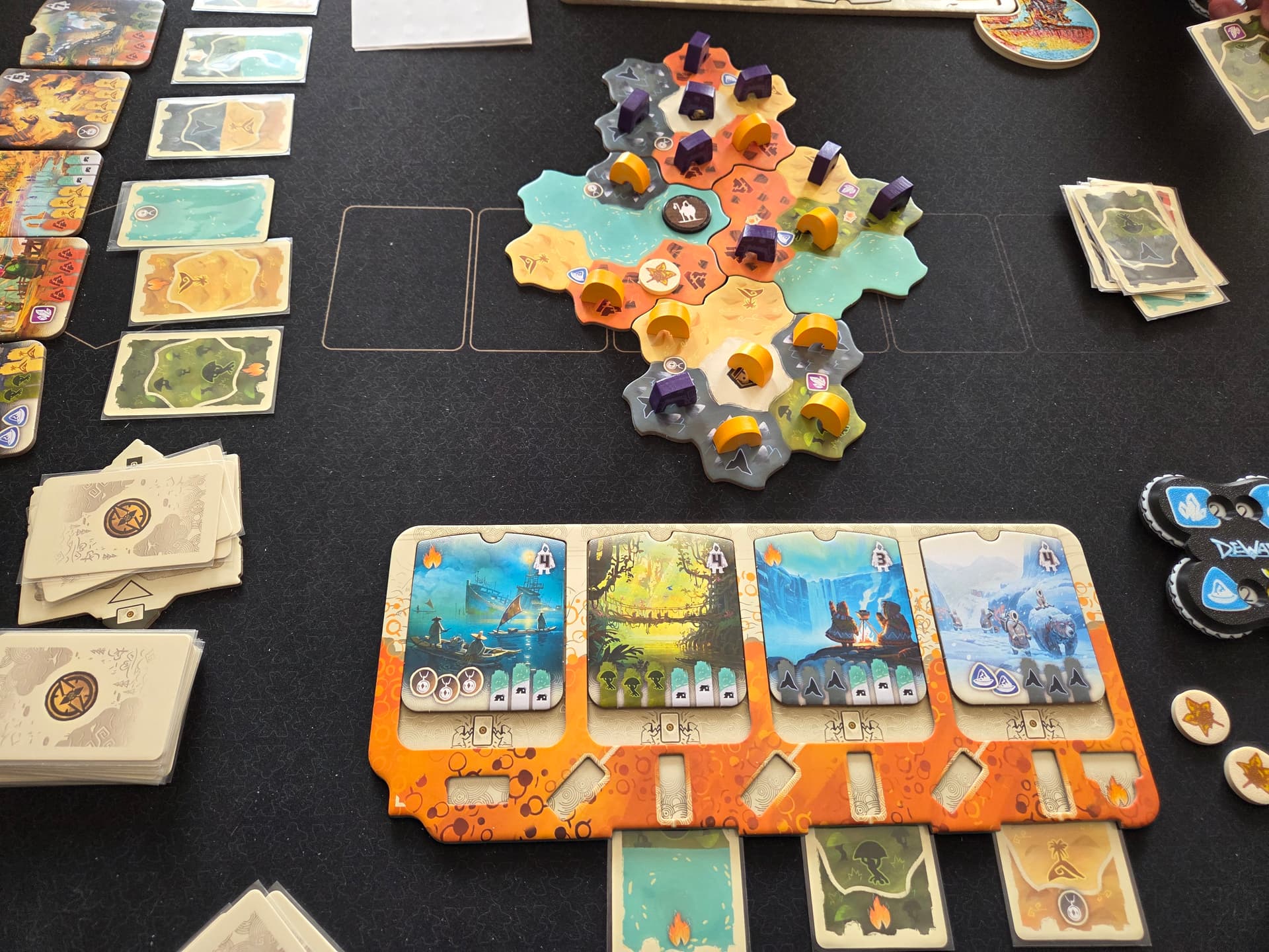 Je me questionne encore sur ce jeu. La position de départ (asymétrie d’ouverture), le tirage des tuiles (variance de la mise en place) qui peut rendre les choses compliquées au démarrage, donne parfois l’impression de subir plus que de construire. Selon les premières sorties, on doit souvent corriger une situation plutôt que développer une stratégie. Ou corriger une situation pour développer sa stratégie…