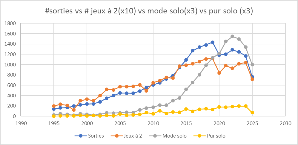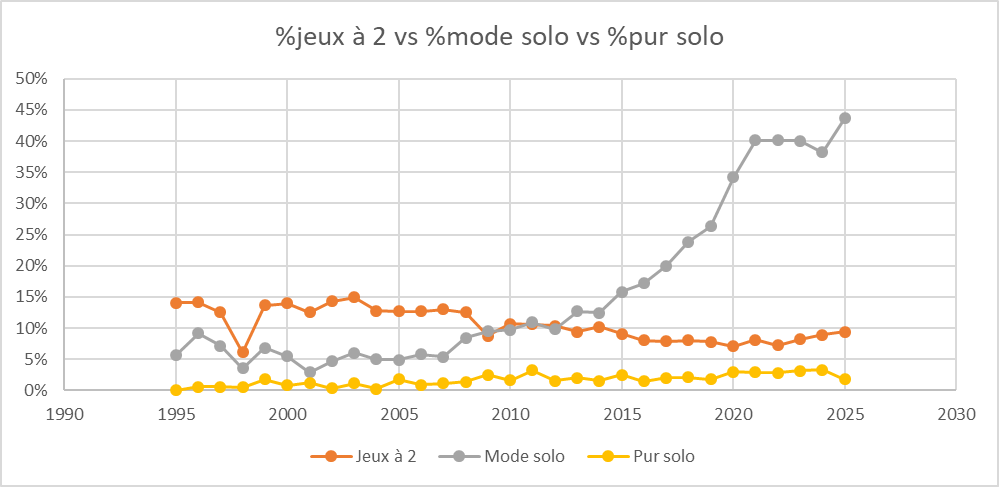 La dynamique d’explosion des sorties de jeux avec mode solo est décalée de 5 ans de celles des jeux tout formats et des jeux à deux. Par contre on voit que la courbe de baisse récente dans le nombre de sorties est coordonnées quelque soit le segment (nouveaux jeux au global, jeux à deux et jeux à mode solo baissent en même temps)