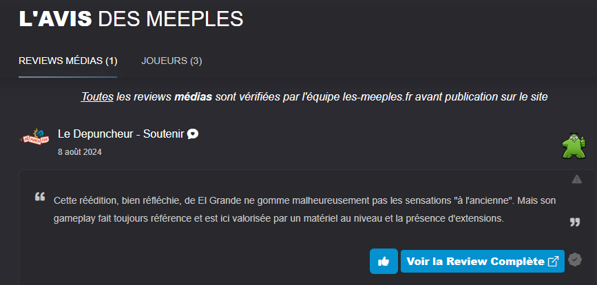 Et à mes yeux, El Grande fait parti de ces grands classiques qui vieillisse comme le bon vin… (tout comme plein d’autres jeux, dont par exemple Samuraï, autre jeu de majorités dont on parle bcp sur un autre topic et qui est décrit comme un jeu “méchant”, ce qui m’étonne grandement mais montre que les jeux “récents” ne veulent plus la moindre interaftion car sinon “c’est méchant”. D’oùle fait qu’il ne sorte quasi plus de jeux de majo - sur la page de Rio Grande Games, il y en a deux d’annoncés pour Mars d’ailleurs, sans fiches sur BGG oun ailleurs pour le moment…).