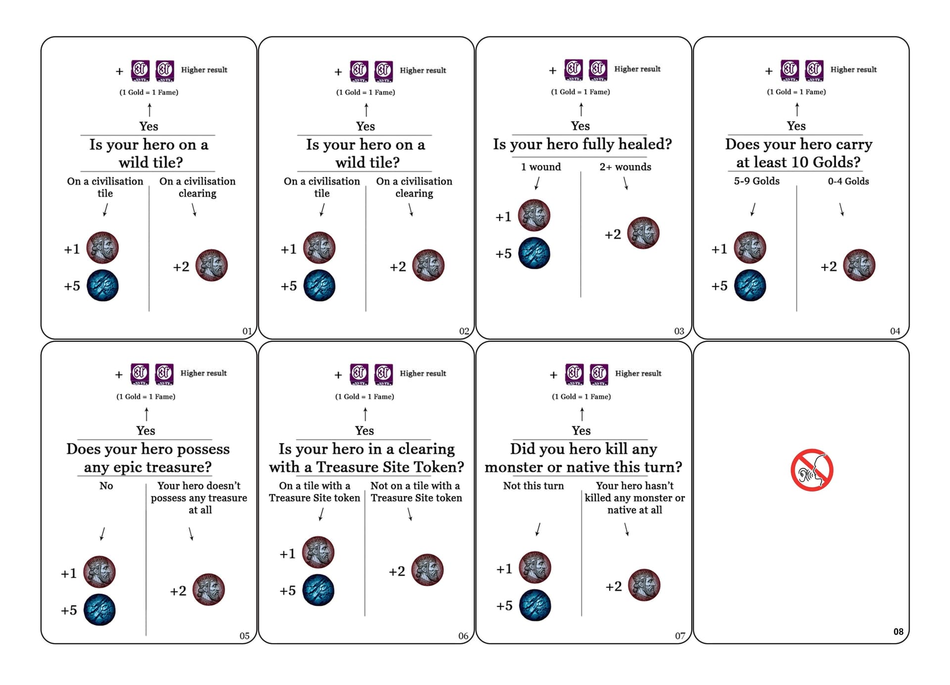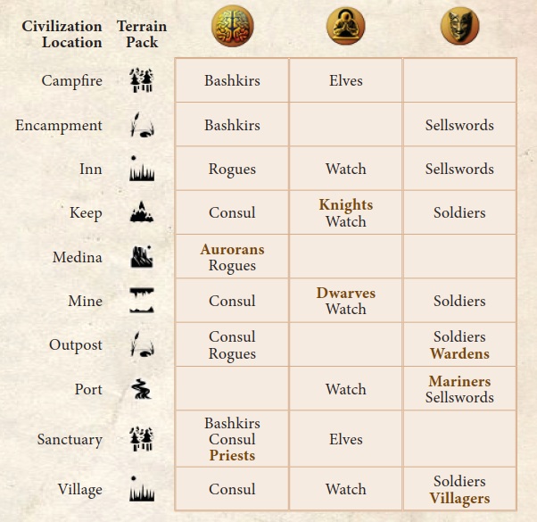 une carte Mission, une carte Objet et une carte Trésor sont posées face cachée à côté de la carte de civilisation autochtone et les héros peuvent effectuer un échange s’ils se trouvent dans la même clairière qu’eux.
