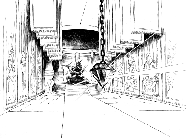 Pour vous faire patienter, voici une illustration d’Emmanuel Roudier, en avant-première! Vous vous avancerez bien pour aller voir cette statue de plus près non? Ou bien pour récupérer l’énorme diamant qui n’attend que vous…