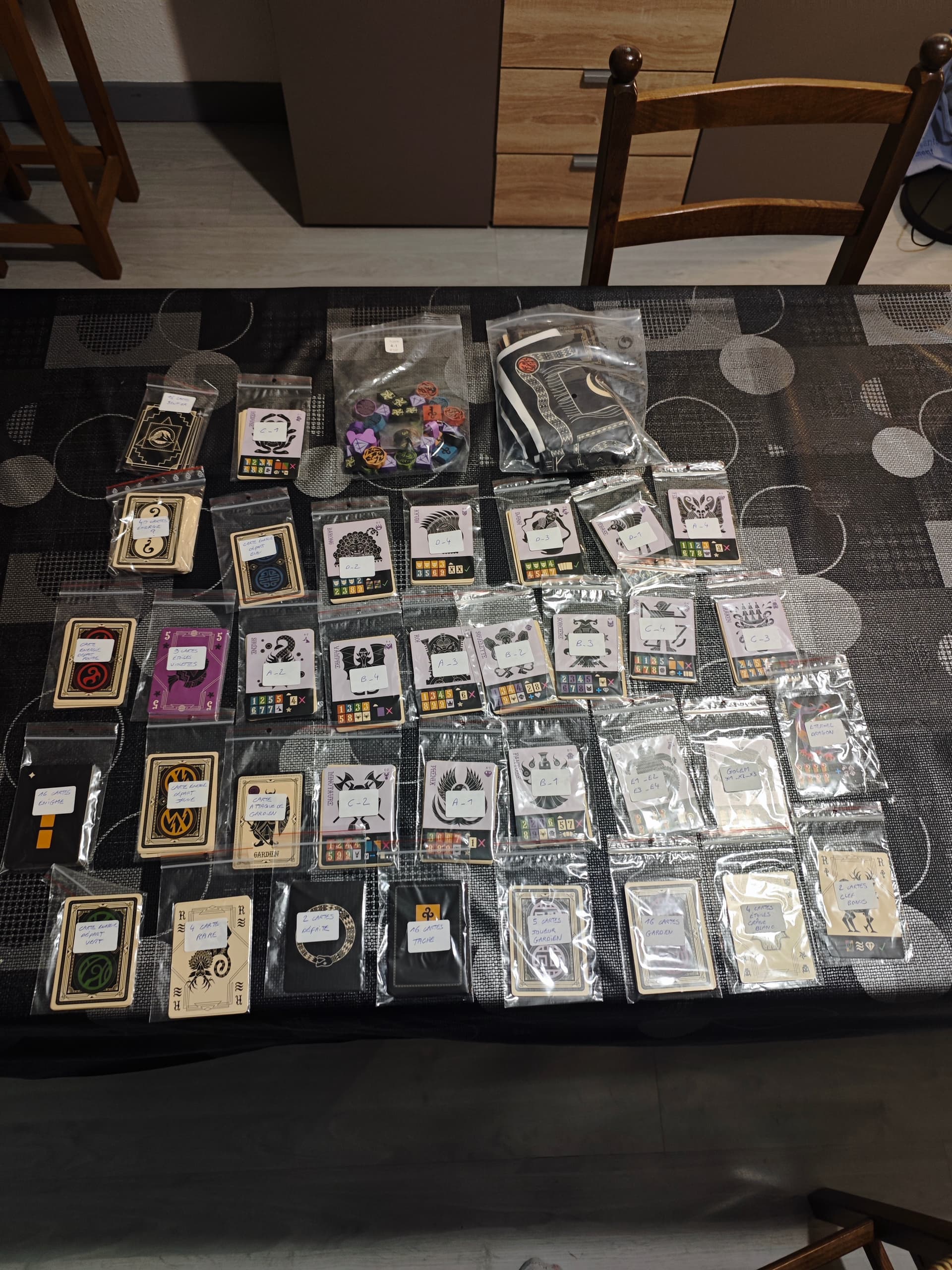 Sur la 2nde colonne, j’ai mis d’abord les cartes joueurs, puis les généralistes (sentiers, R), et enfin tout le reste dont on ne se sert pas pour le palier A.