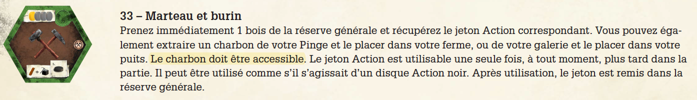 n°33 Marteau et burin : “le charbon doit être accessible” signifie que le cube qui va être extrait doit se trouver à droite d’un emplacement étai occupé, et il ne faut pas qu’il y ait trop d’eau dans la mine (moins de 2 gouttes pour la pinge, et moins de 5 pour la galerie).