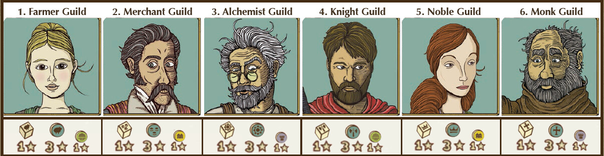 Exemple : diriger en début de partie une ville avec un pion marchand ou un pion noble permet d’entrer dans la guilde correspondante avec 2 influences (1 influence pour le pion + 1 influence pour le terrain). Diriger 2 villes en ayant un pion marchand et un pion noble sur le plateau, c’est avoir 3 influences dans chacune de ces guildes.