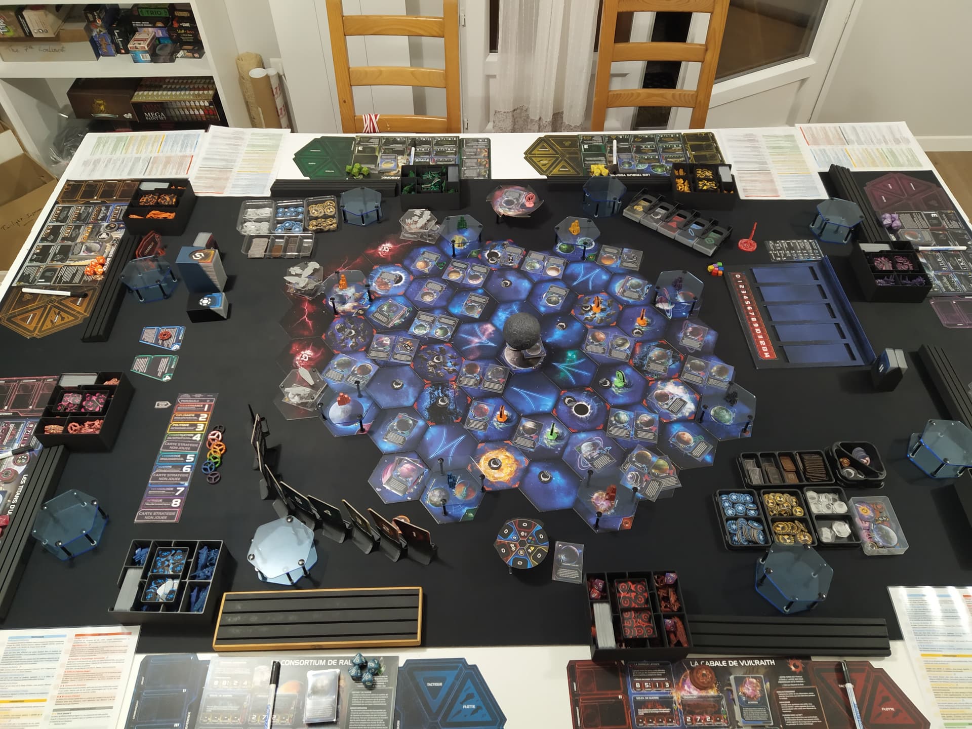 Sur la dernière partie, on a ajouté quelques éléments de Thunder’s Edge. En particuliers, on a ajouté l’évènement “Age of Commerce” (Galactic Events | Twilight Imperium Wiki | Fandom) en début de partie. C’était complètement n’importe quoi, avec tout le monde avec plein de technos (un joueur a sorti un Warsun pour la 1ère fois) et plein de négo dans tous les sens. Je ne recommande pas cet évènement en particuliers, autant ça a accéléré la montée en puissance de tout le monde, mais ça n’a pas raccourci la partie car on négociait davantage.