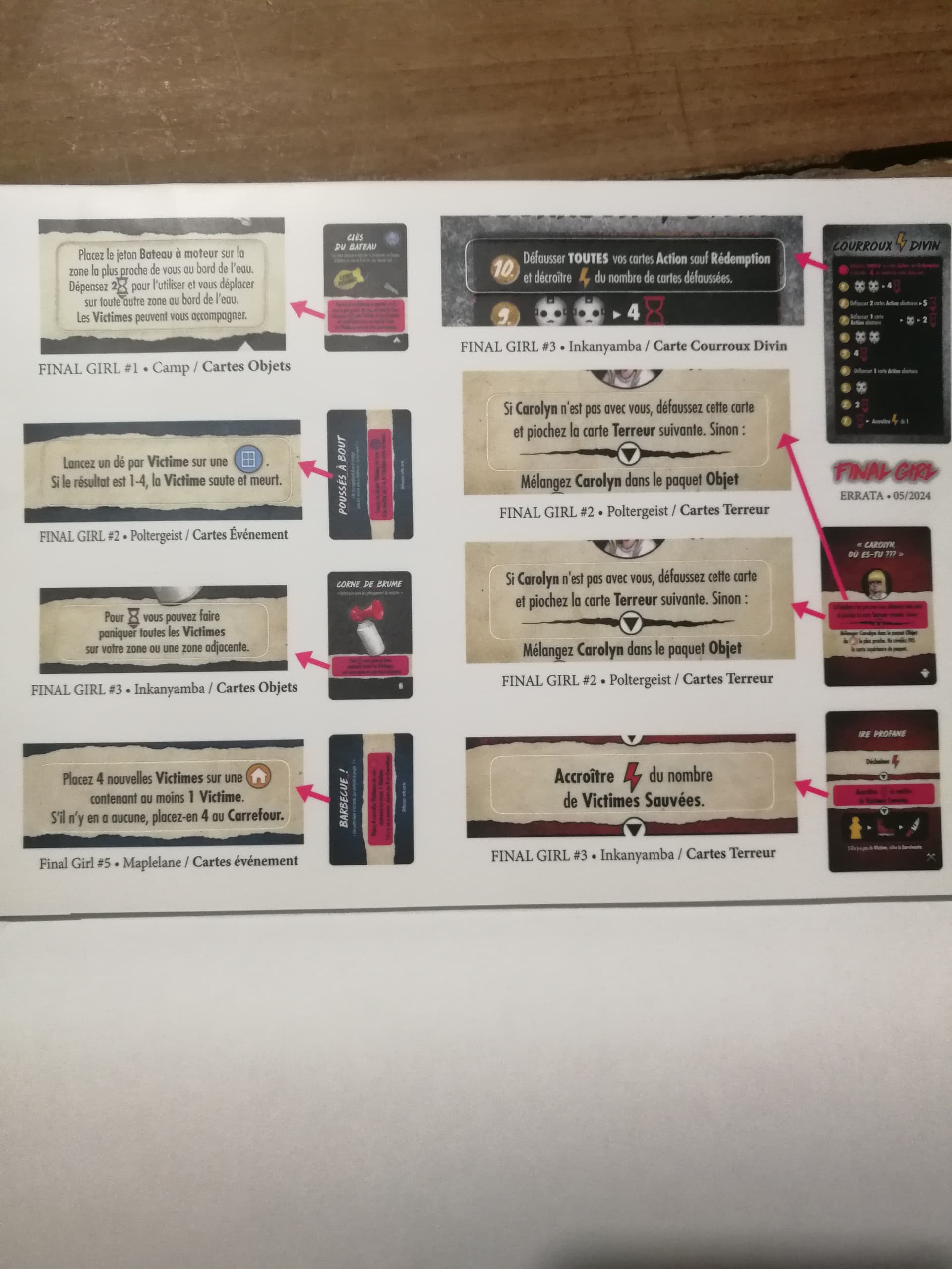 Pour la carte objet “Clés du bateau”, il faut remplacer “Dépenser 2 temps pour l’utiliser et vous déplacer sur toute autre zone contenant de l’eau.” par “… et vous déplacer sur toute autre zone au bord de l’eau.”