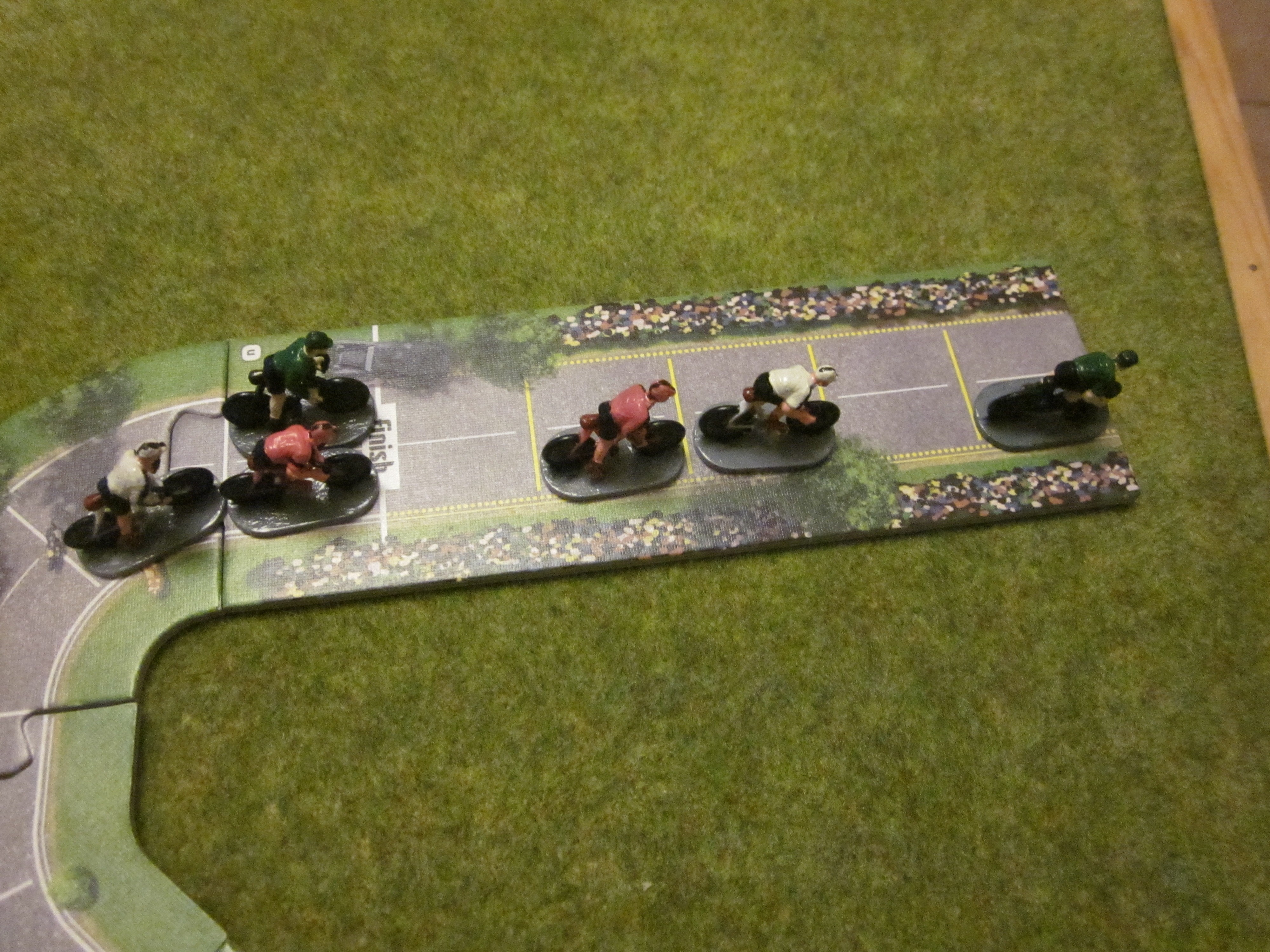 Du coup, les verts décident de se la couler douce cette fois, et laissent les deux autres équipes jouer des coudes. A tel point que leur sprinteur prend le vent dès la première côte. Il laisse filer une ou deux cases, et ça en sera fini de lui pour le reste de la course. C'était une étape de repos pour ce grand gaillard, il faut croire.