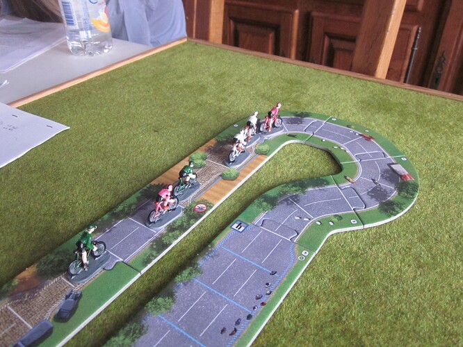 Départ du peloton à halure modéré. Malgré 2 tentatives de sortie du sprinter de la muscle team, l’équipe peloton rentre toujours sur lui à l’aspiration. Pour ma part, j’en profite pour sucer les roues un maximum en permettant à mon sprinter de toujours profiter de l’aspiration de mon rouleur. Je gagne ainsi à chaque tour entre 1 et 3 déplacement avec mon sprinter. A mi-course, j’anticipe mal le déplacement du peloton et je me vois décramponné de deux cases. Je suis donc obligé d’utiliser un 9 pour revenir dans le peloton. A 2/3 de la course je remonte en tête de peloton et me met cote à cote pour bloquer les autres coureurs. opération réussi : tous les adversaires perdent 1 déplacement et le sprinter de la muscle en perd même 2.