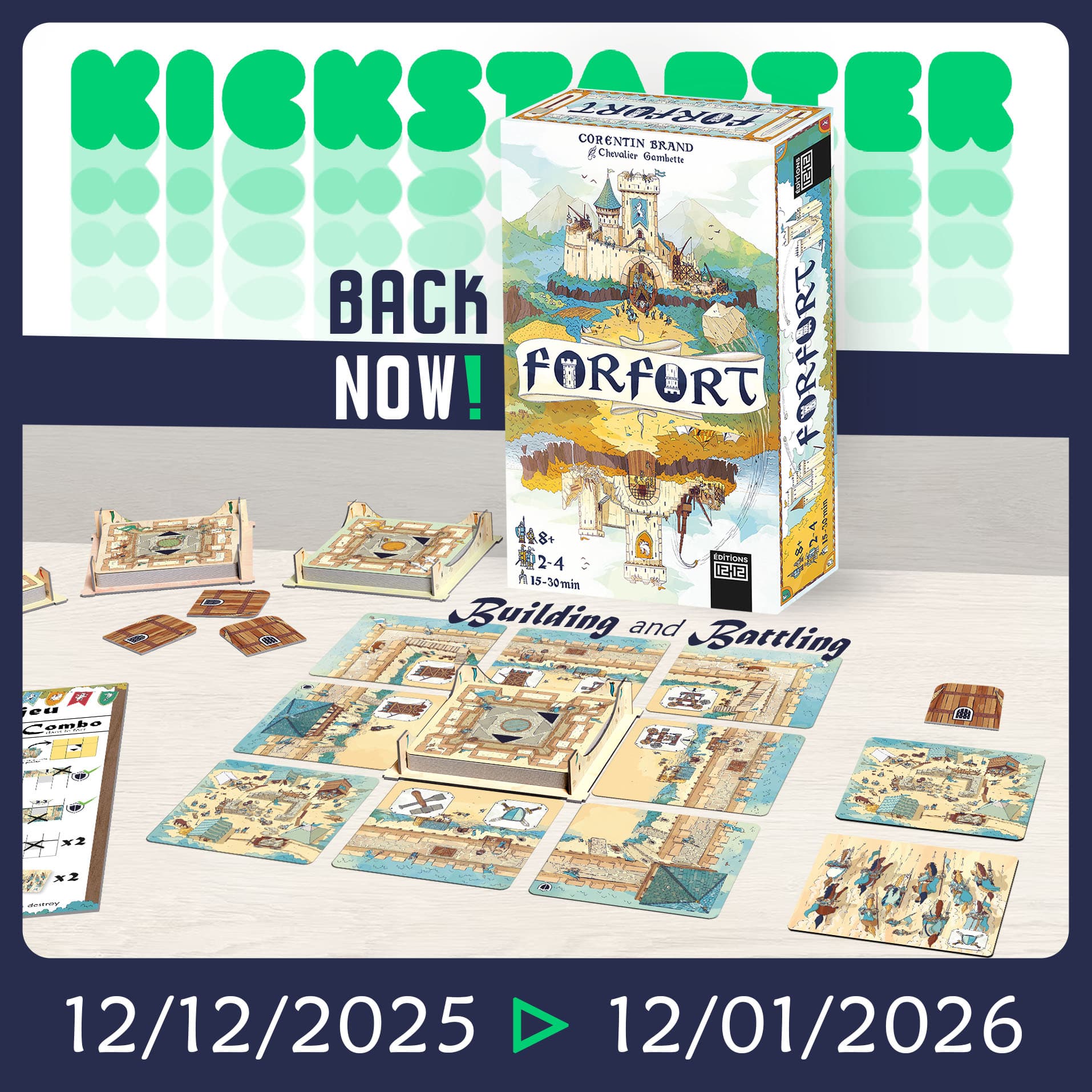 Celui ou celles qui finit son fort en premier gagne la partie. Un jeu de Corentin Brand, illustré par Chevalier Gambette.