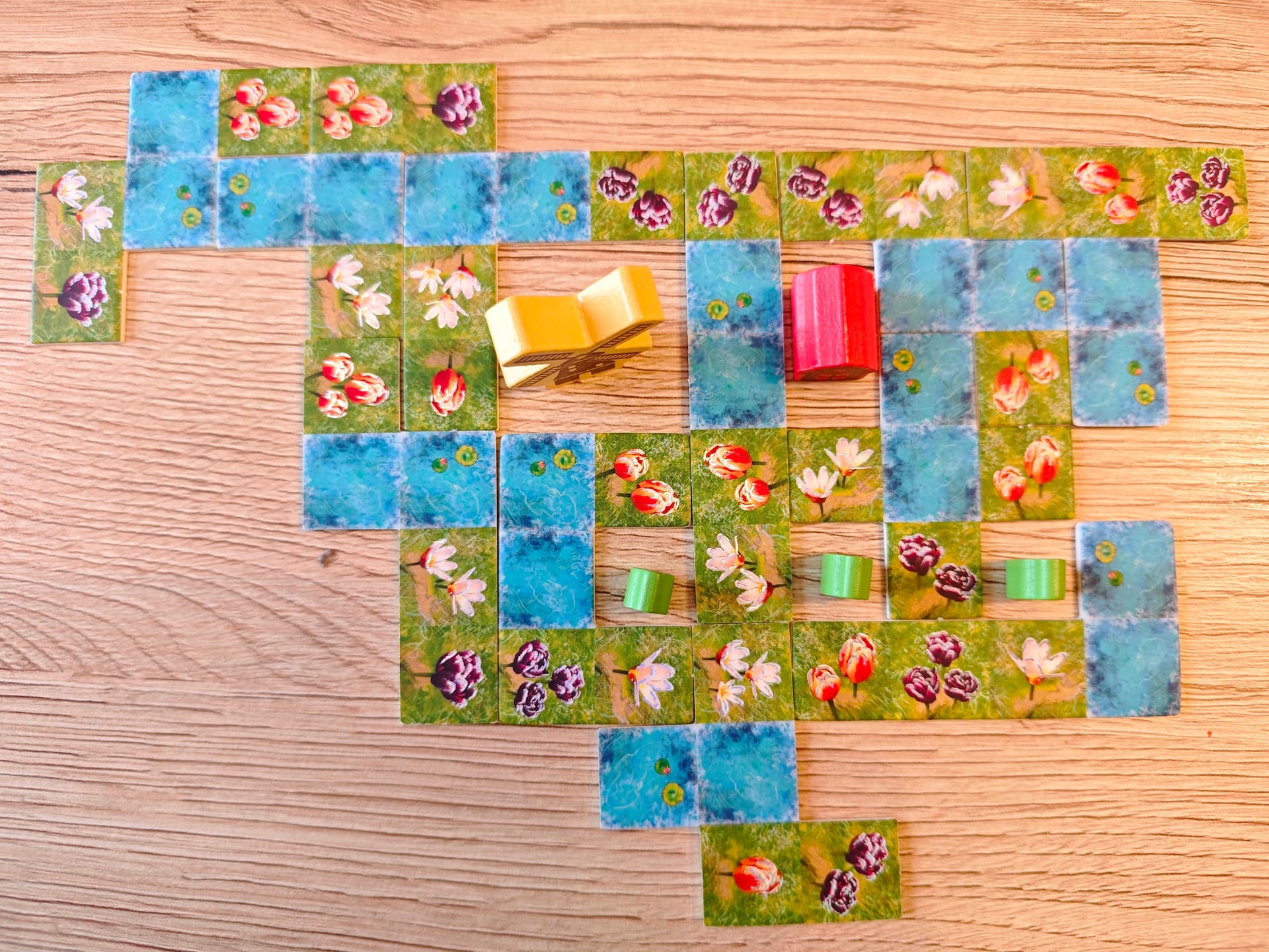 Placer la tuile choisie dans votre jardin. Elle doit être adjacente orthogonalement à une tuile déjà en jeu, la rotation de la tuile est libre. Vous n’êtes pas obligé de la connecter à un terrain de même type.