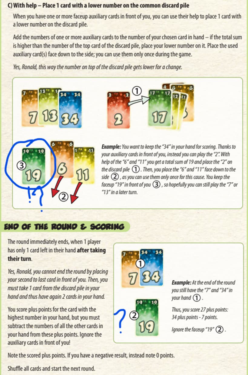 Ici c’est la règle de FTW ?! de Friedmann Friese auquel je voudrais apporter des précisions. Dans le cas #3 où on pose une carte en ajoutant les cartes supports (auxiliary dans la règles anglaise) apparait une carte 19, qui j’en suis sûr n’a rien à voir avec le buzin et le principe du jeu. En effet la carte est potentiellement déjà passée/non disponible car dans la main d’un adversaire, bref elle a pas de raison d’apparaitre ici. Dans la pose #3, on ajoute une carte sur la pile (inférieur à la valeur de la pile) en s’aidant de nos cartes auxiliaires pour obtenir une valeur plus grande. Mais on ne « crée » pas, ni obtient pas, la carte de cette valeur… Bref grosse confusion possible… ![]()