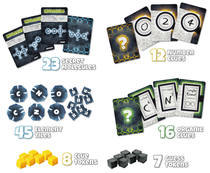 One player takes on the role of the “Knower”, who has access to the Secret Molecules while all other players are the “Builders”, who must try to identify the structure of the Secret Molecules through a series of Clue cards given to them by the Knower.