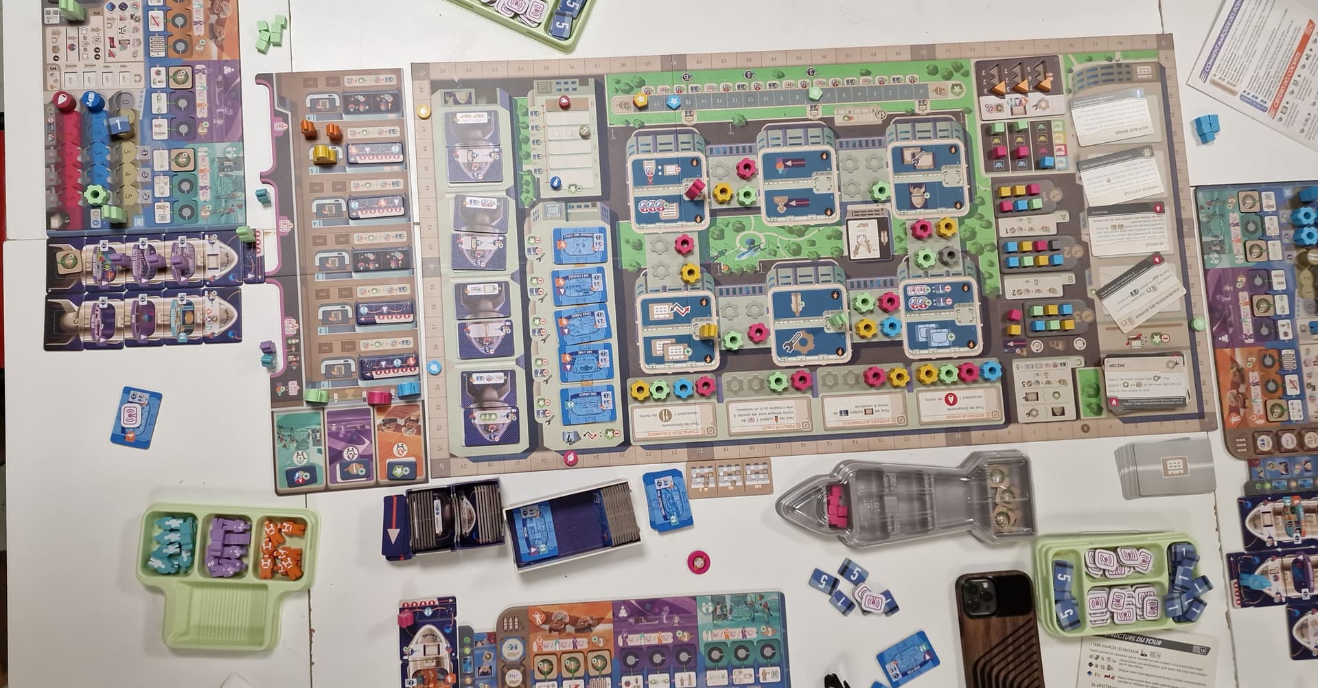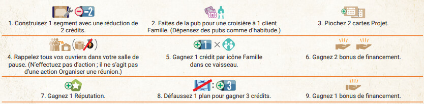 => c’est amusant ce détail : souvent les jeux économiques reprennent des concepts du monde réel (on fait des centrales / des champs / des usines /… etc) : ici c’est la Croisièr equi va rapporter selon qu’on l’a bien optimisé - les rouages qui étendent nos actions par tour : un meeple sur une des 6 cases actives a le choix entre 2 actions sur cette case ; masi si t’as financé un rouage avec la case adjacente, ce même meeple accède alors aussi aux 2 actions de la case adjacente - quitte à payer pour profiter d’un rouage tierce