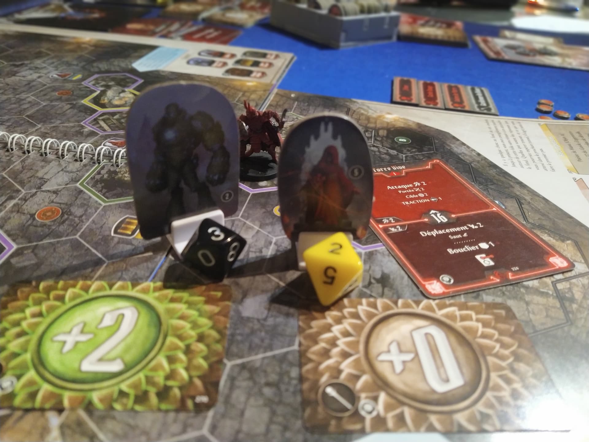 J’ai tenté le baroud d’honneur du garde avec la carte force vive. Le Misérable Zélote avec ses 2 PV (+0 de modif) tombe. Et enfin le tour du Golem a qui il restait 3 PV + 1 d’armure. Mais le dieu des cartes a parlé. Tirage d’un modificateur +2