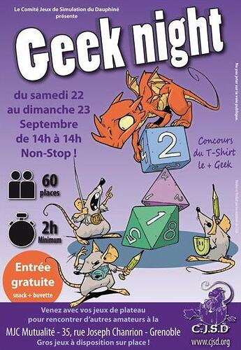du samedi 22,14h au dimanche 23 sept 14h à la MJC Mutualité de Grenoble le CJSD organise sa première Geek Night ! Venez jouer entre Geeks à des gros jeux. Il n’y auras que des GROS JEUX avec un minimum de 2h par parties qui seront acceptés (pas la peine de venir avec Time’s Up par exemple). Il y aura des jeux à disposition, mais surtout vous pouvez amener VOTRE GROS JEU préféré ! Si, si , celui qui fait peur a tout le monde tellement que c’est long… Ben là c’est l’moment de l’dépoussiérer !