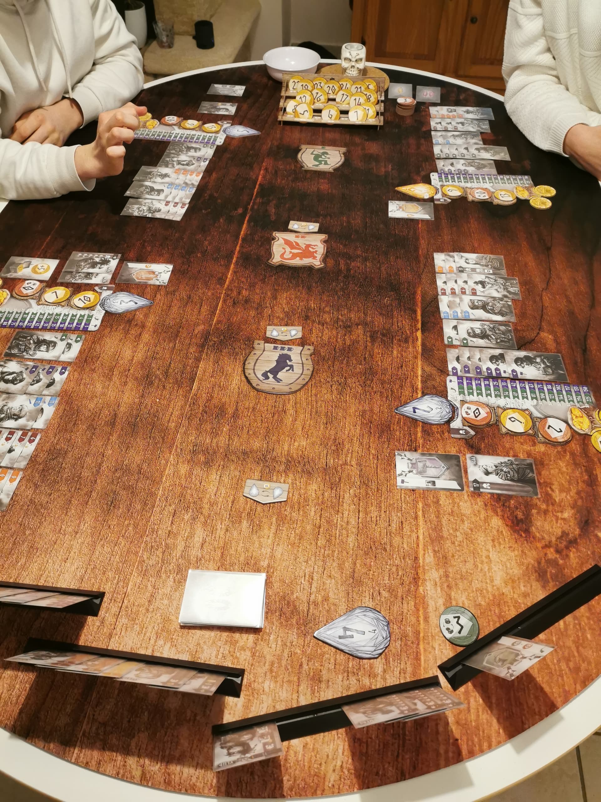 - Endeavor : joué la v2 kickstarter, mais sans extensions ; je suis le seul à démarrer avec le bâtiment qui colonise, les 3 autres ont choisi de naviguer ; je me rattrape un peu avec l’acquisition des docks (qui permet de naviguer + coloniser), mais je n’ai pas l’occasion d’acquérir de bâtiment me permettant de prendre des cartes ; S choisit de découvrir à fond + piocher des cartes, et parait être en tête ; à la fin, P décide d’utiliser son canon en Europe pour me faire perdre 3 points et en gagner 3 : il gagne devant S : 67-66-64-55